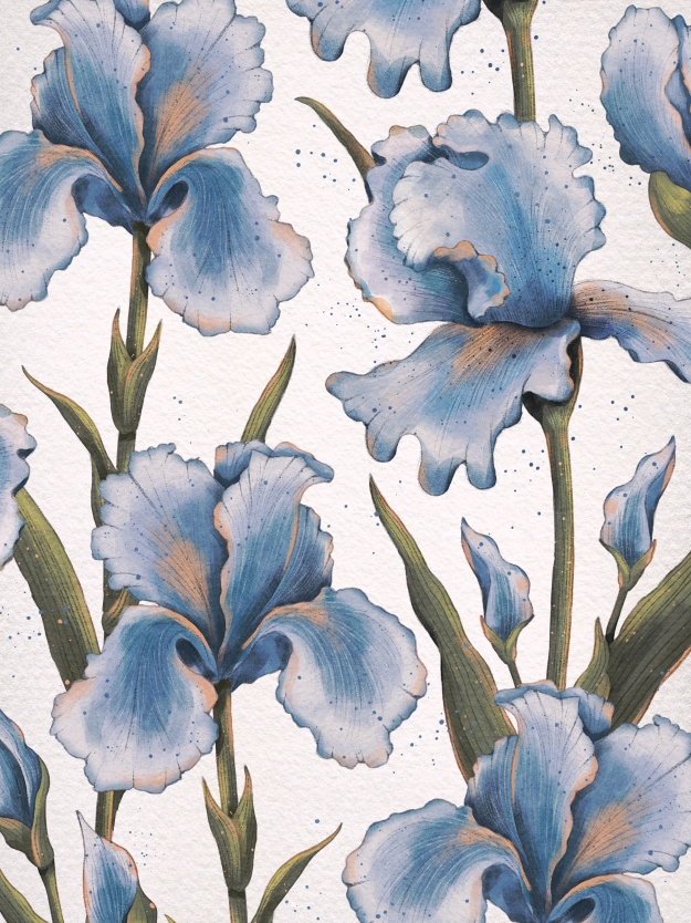 Паттерн с ирисами идеально подойдет для выразительных дизайнерских проектов в самых разных сферах: полиграфия, текстиль, интерьер