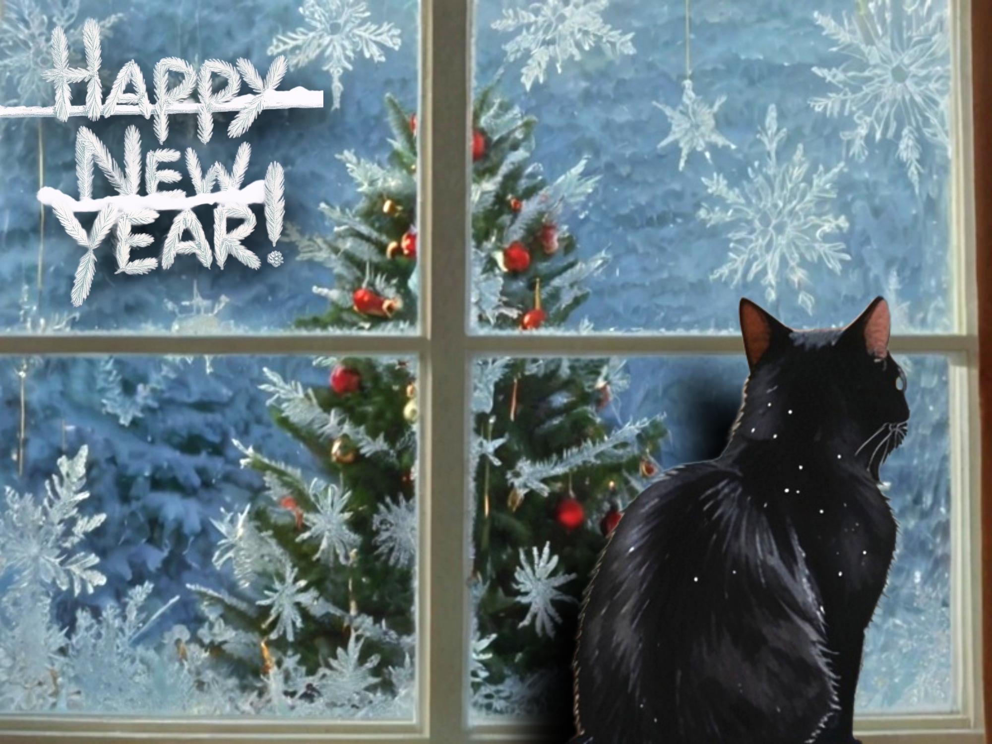 Черный кот на фоне морознго окна и новогодней елки
