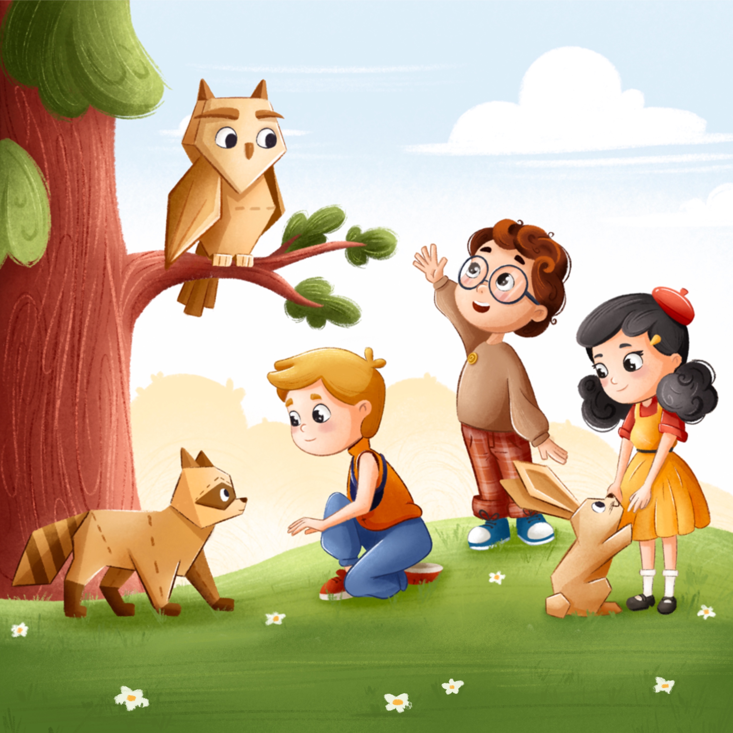 Три друга, Гофрося,Крой и Лина, знакомятся с картонными животными из леса. Гофрося машет рукой картонной сове. Лина держит за лапки картонного зайчика, а Крой тянется к картонному еноту. Ожившие фигурки из картона, пришли на помощь главным героям.