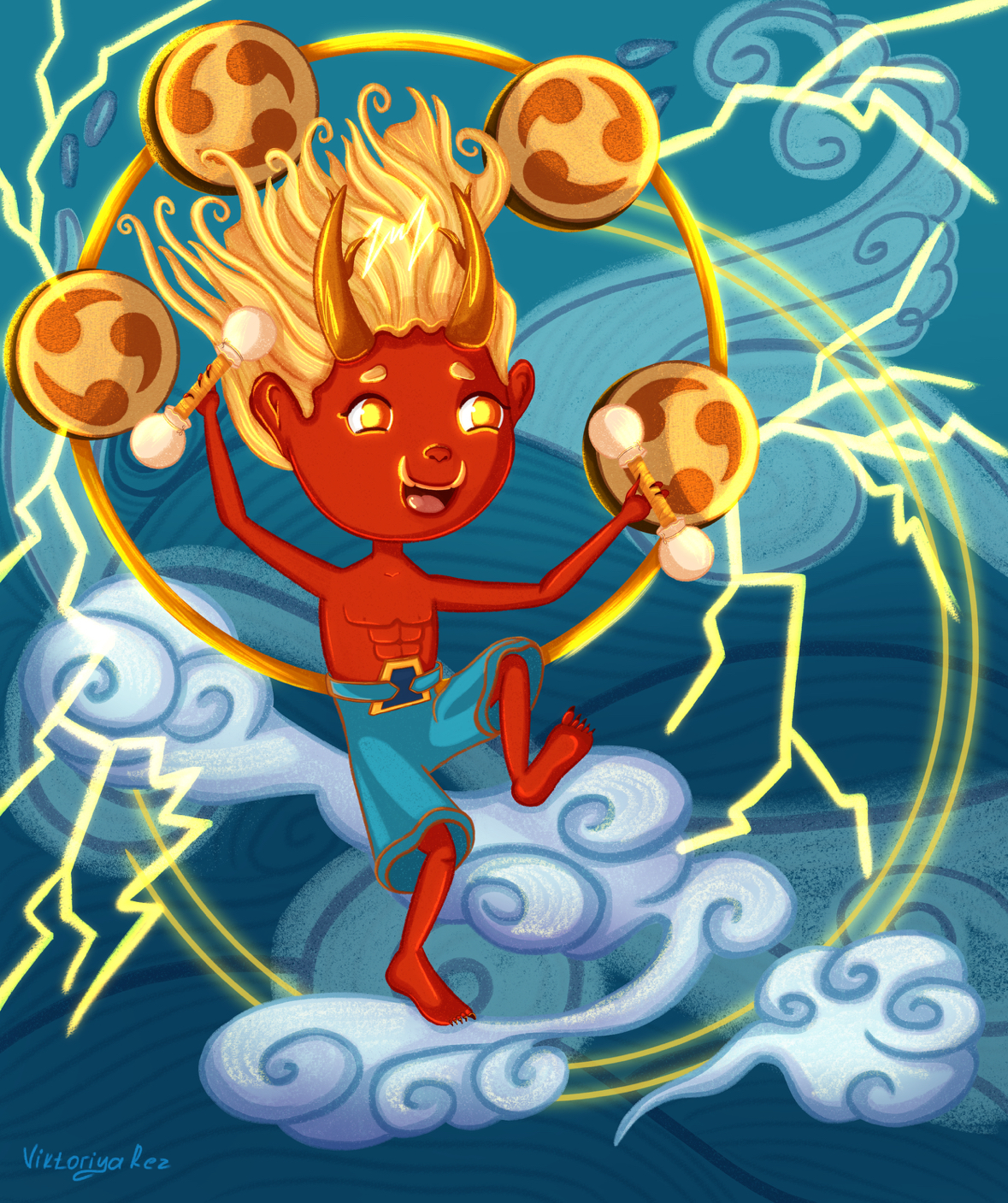 Райдзин (雷神, буквально «Бог грома»). Его облик и роль связаны с грозами, ураганами и ливнями. Вместе со своим братом Фудзином (богом ветра) он управляет небесными явлениями.
