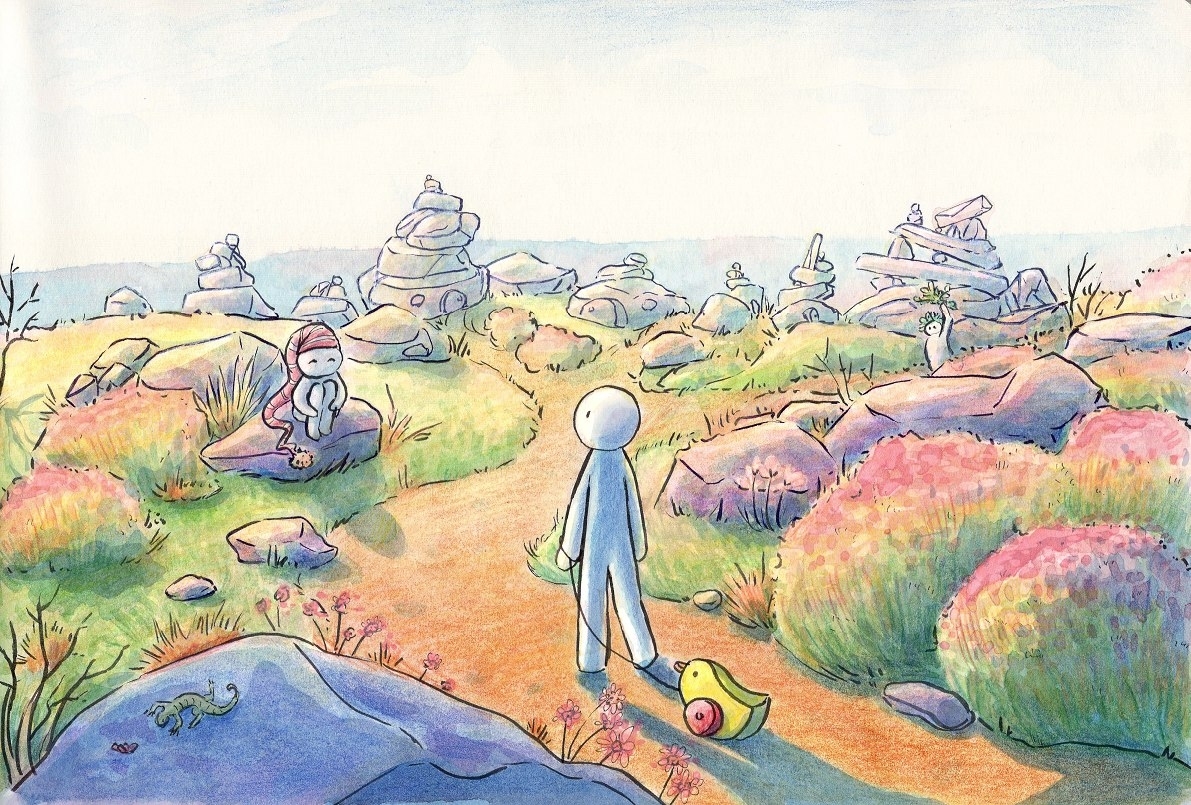 Это история про человечков Тама, один из которых бродит по миру в поисках своей шапочки. Он видит, что у каждого встречного на голове что-нибудь есть. Наверное, и ему полагается найти свою?