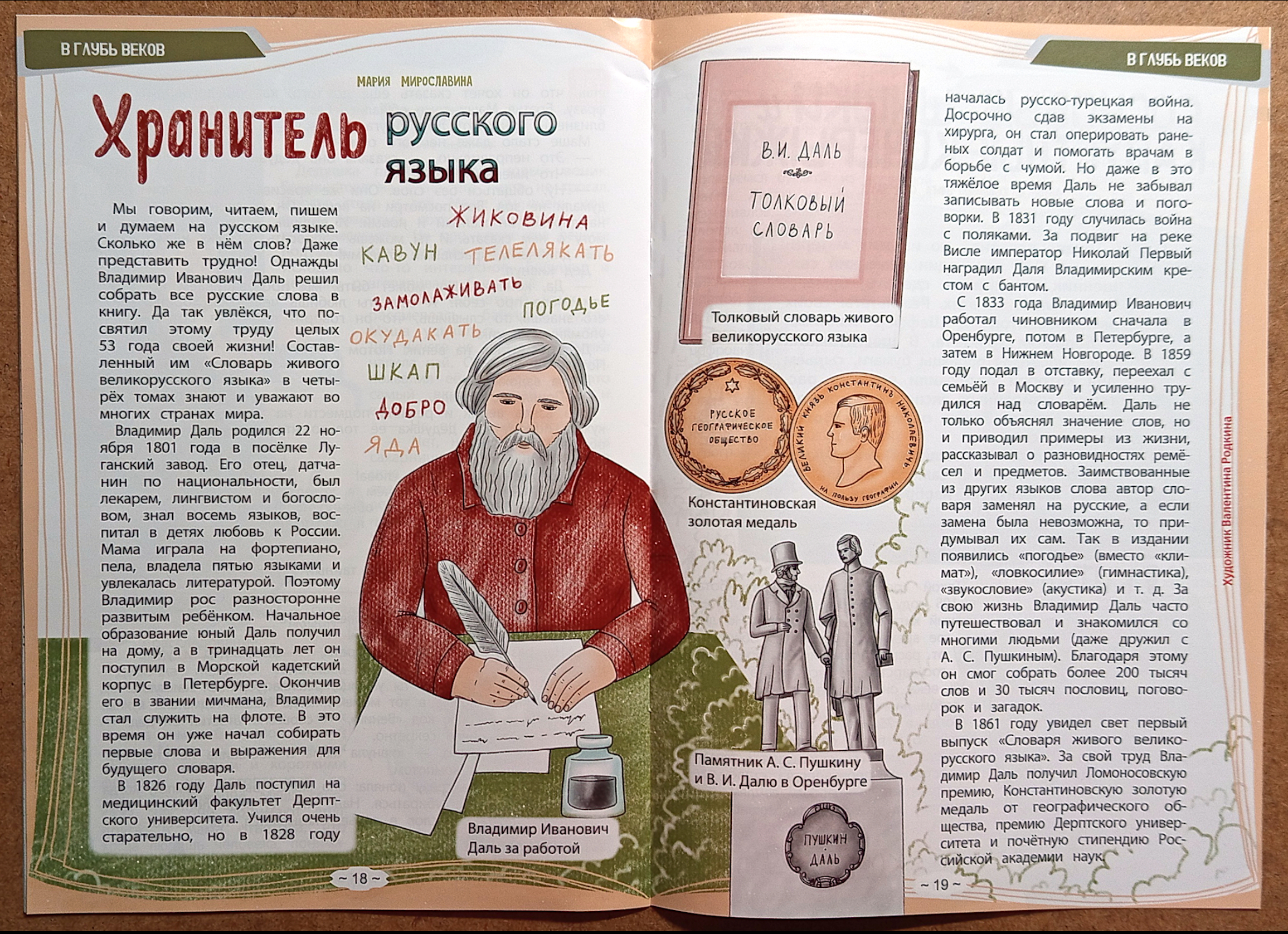 Иллюстрация на разворот к статье "Хранитель русского языка" для детского православного журнала "Саша и Даша" №11 (93), ноябрь 2025г.