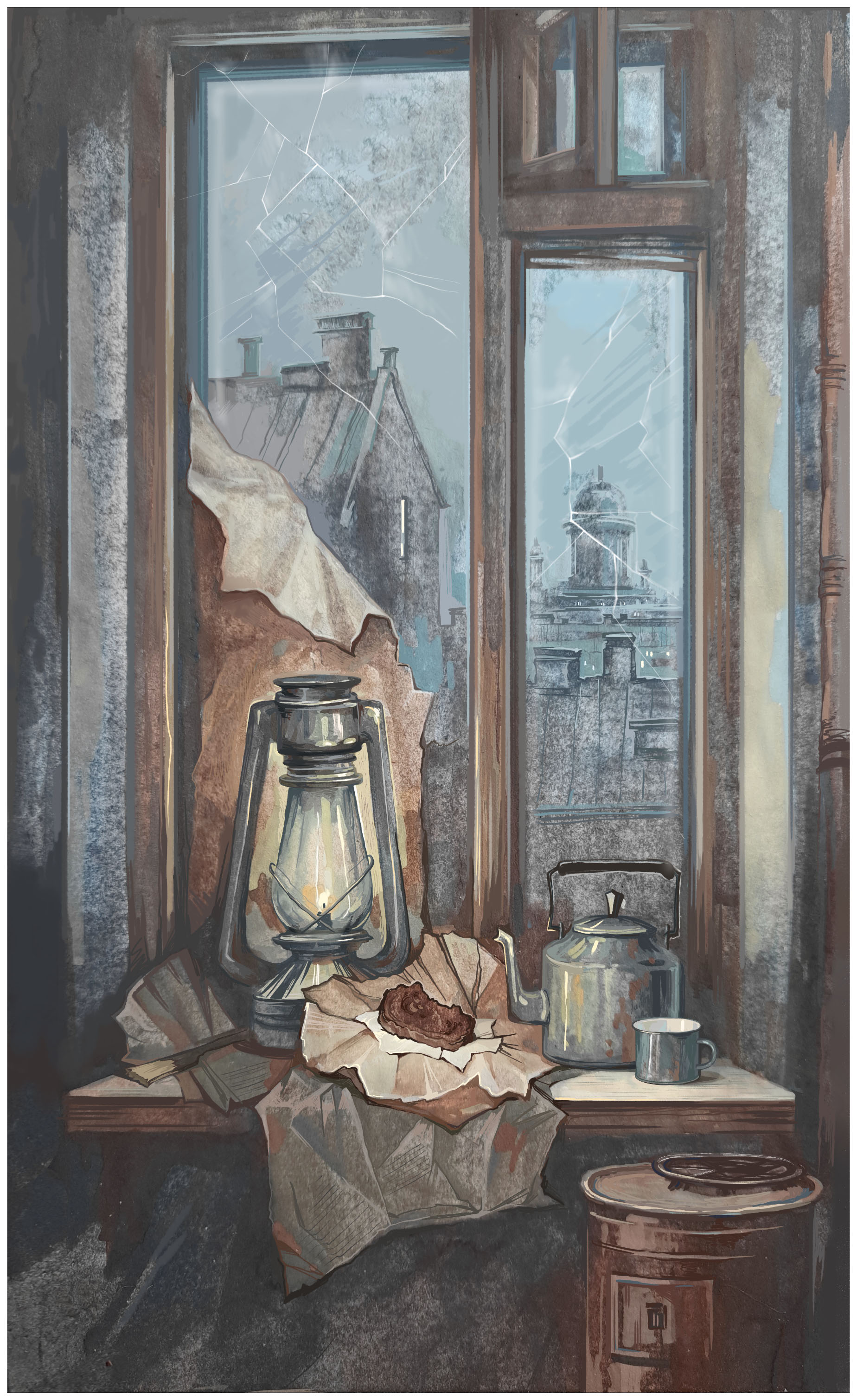 Темнота. Она густая и всепоглощающая, как голод. Но в этой тьме, на холодном подоконнике, живут два священных символа жизни: тусклый свет надежды от коптилки и крохотный кусок хлеба, завёрнутый в слова правды — газетную страницу. Это не просто вещи, это вся жизнь блокадного Ленинграда