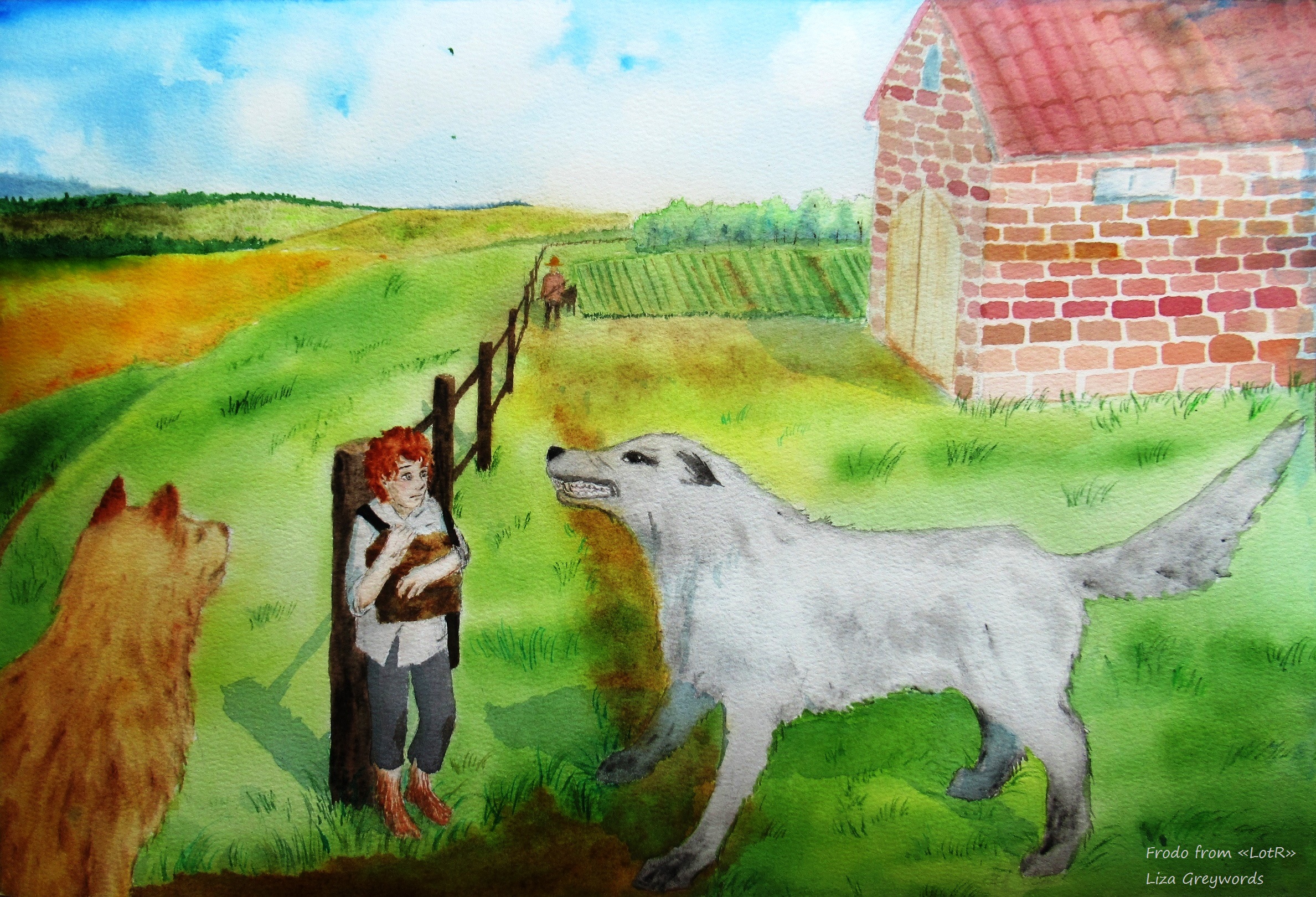 Фродо, пойманный в детстве за воровством грибов у фермера Мэггота. Иллюстрация к главе "Напрямик по грибы" книги "Властелин колец" Д.Р.Р.Толкина.