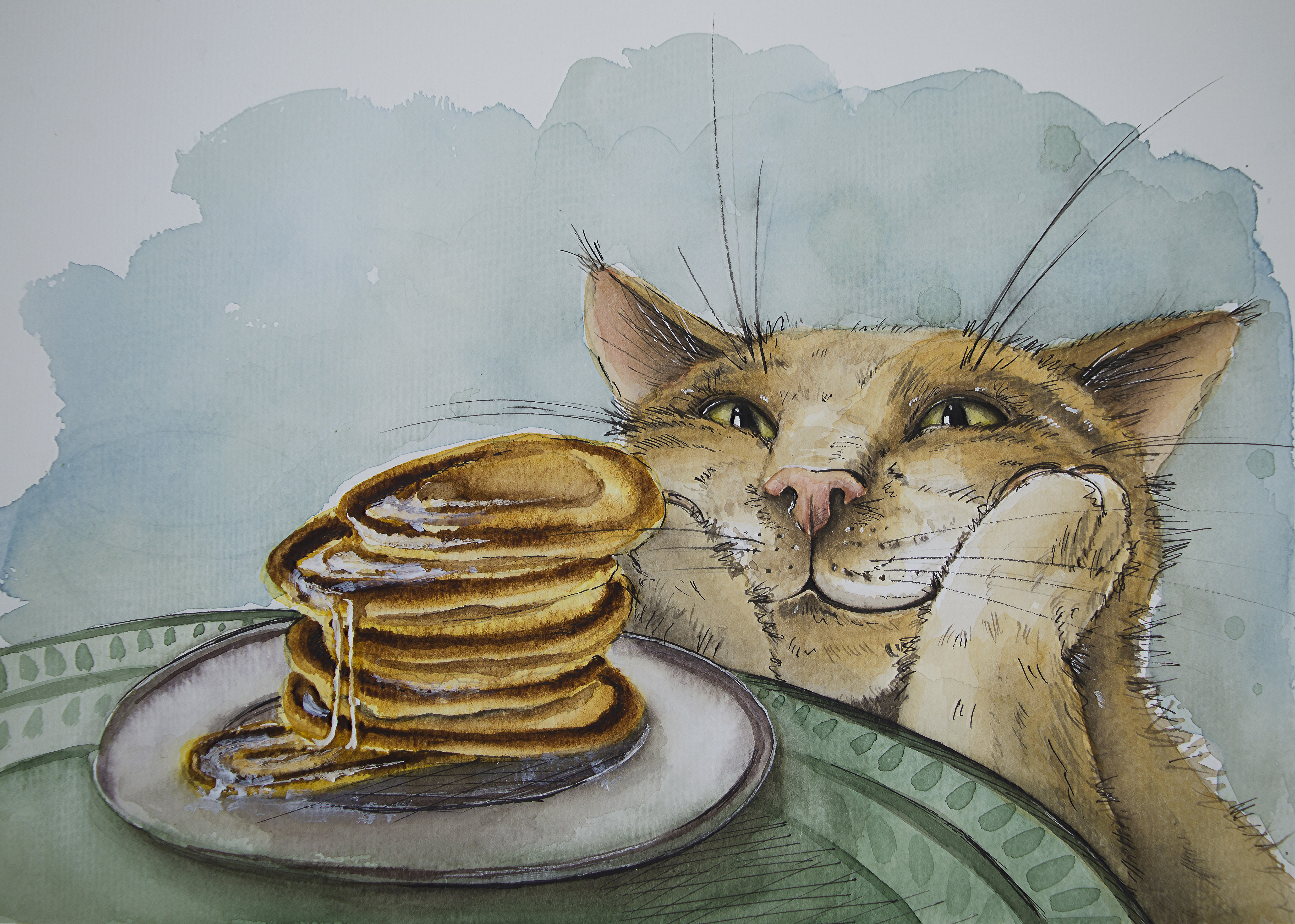 Оладьи. Кот. Акварель