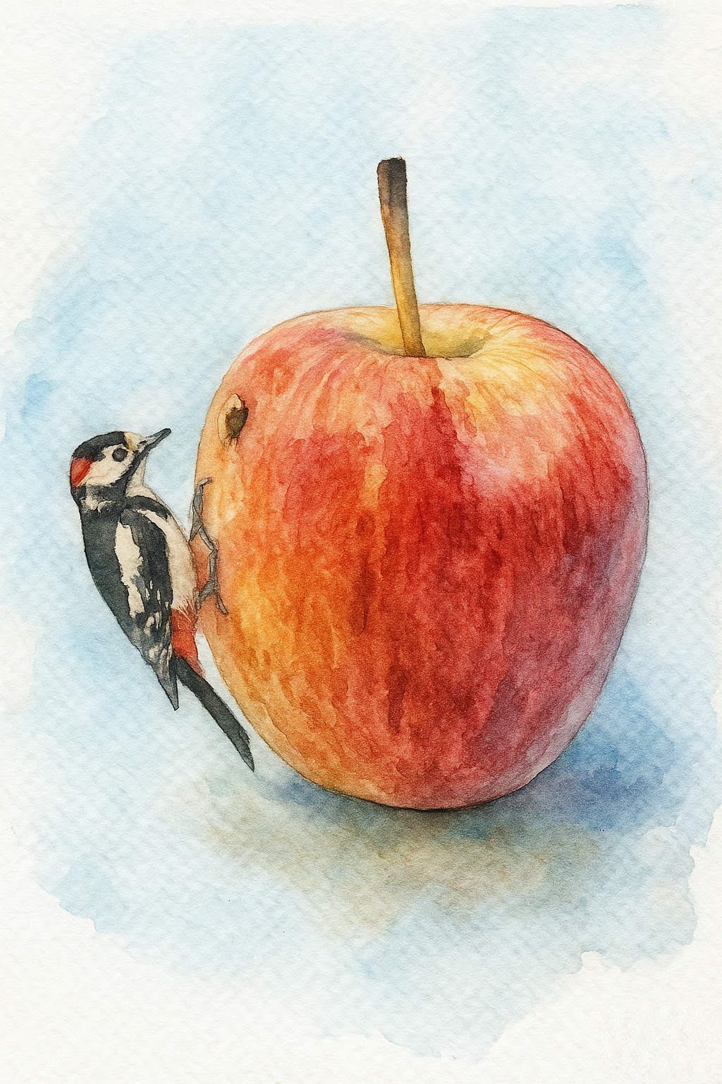 дятел на яблоке