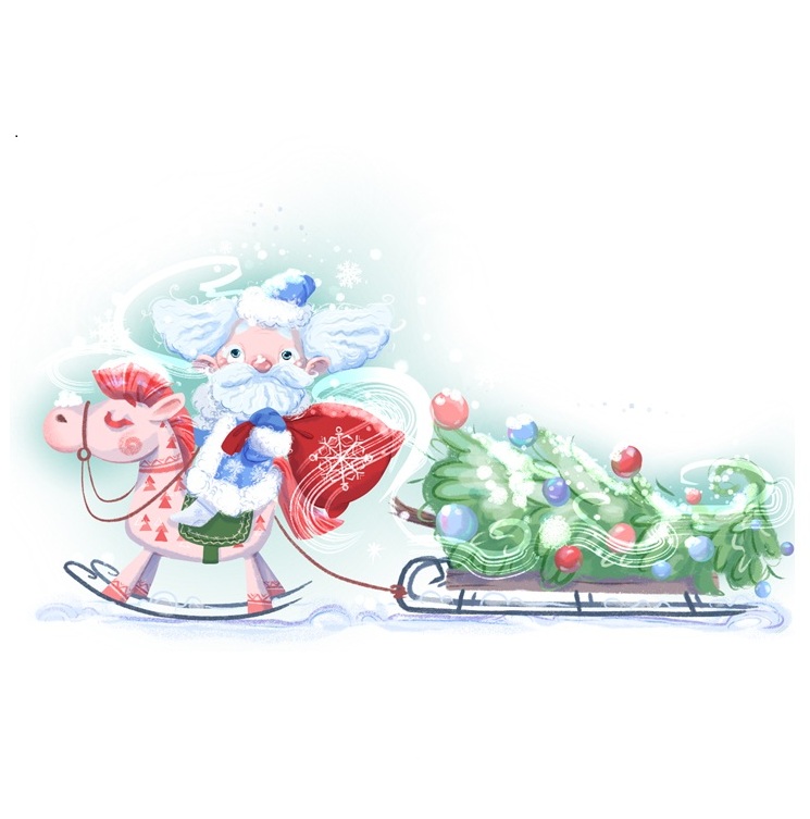 Дедушка Мороз спешит на праздник! Иллюстрация детская для книги, открытки, постера, принта