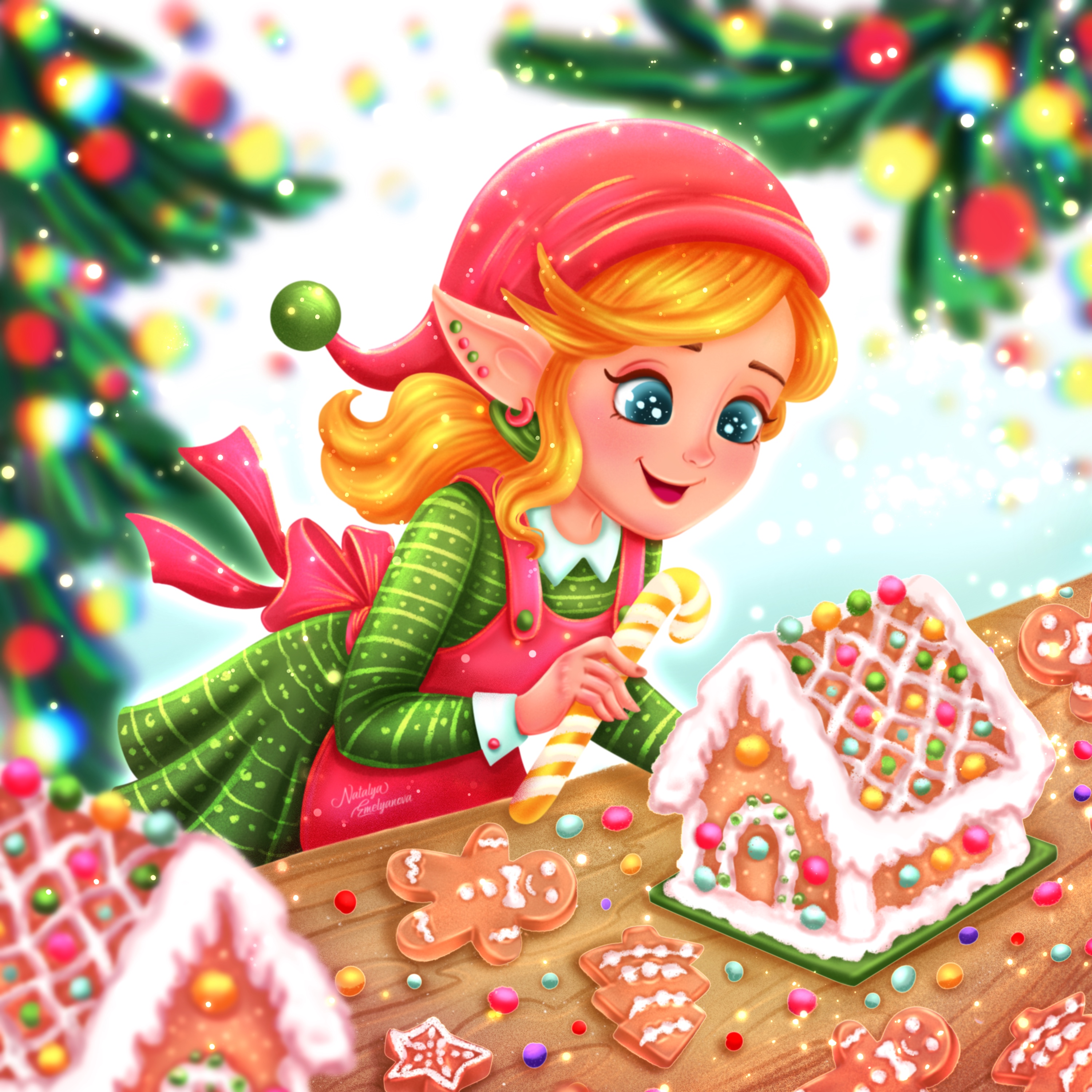 Милая эльфийка украшает пряничный домик в преддверии Нового года. Она добавляет последние штрихи к праздничному украшению, создавая волшебное настроение и предвкушая наступление праздников