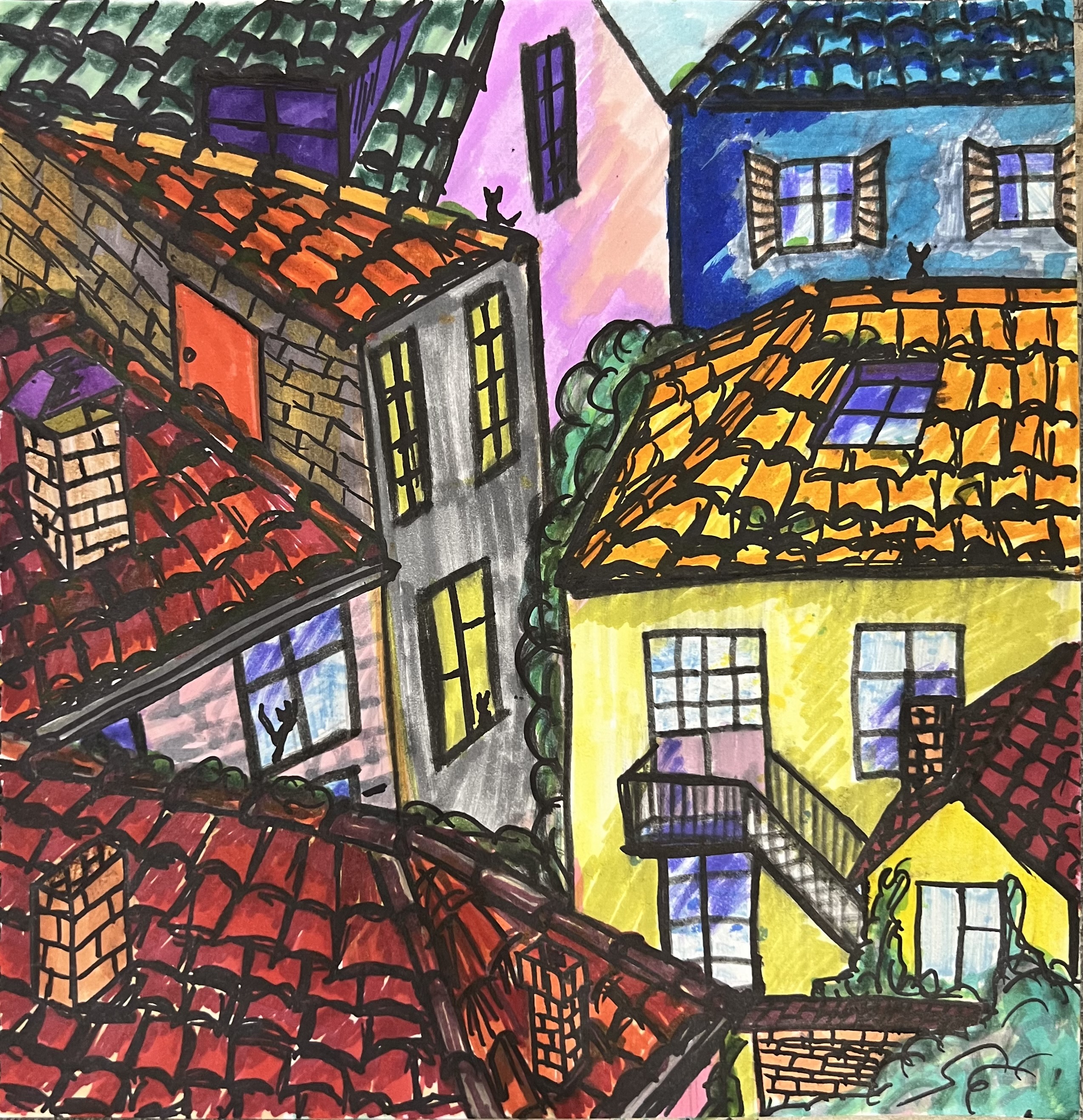 Городские яркие крыши, выполнено маркерами