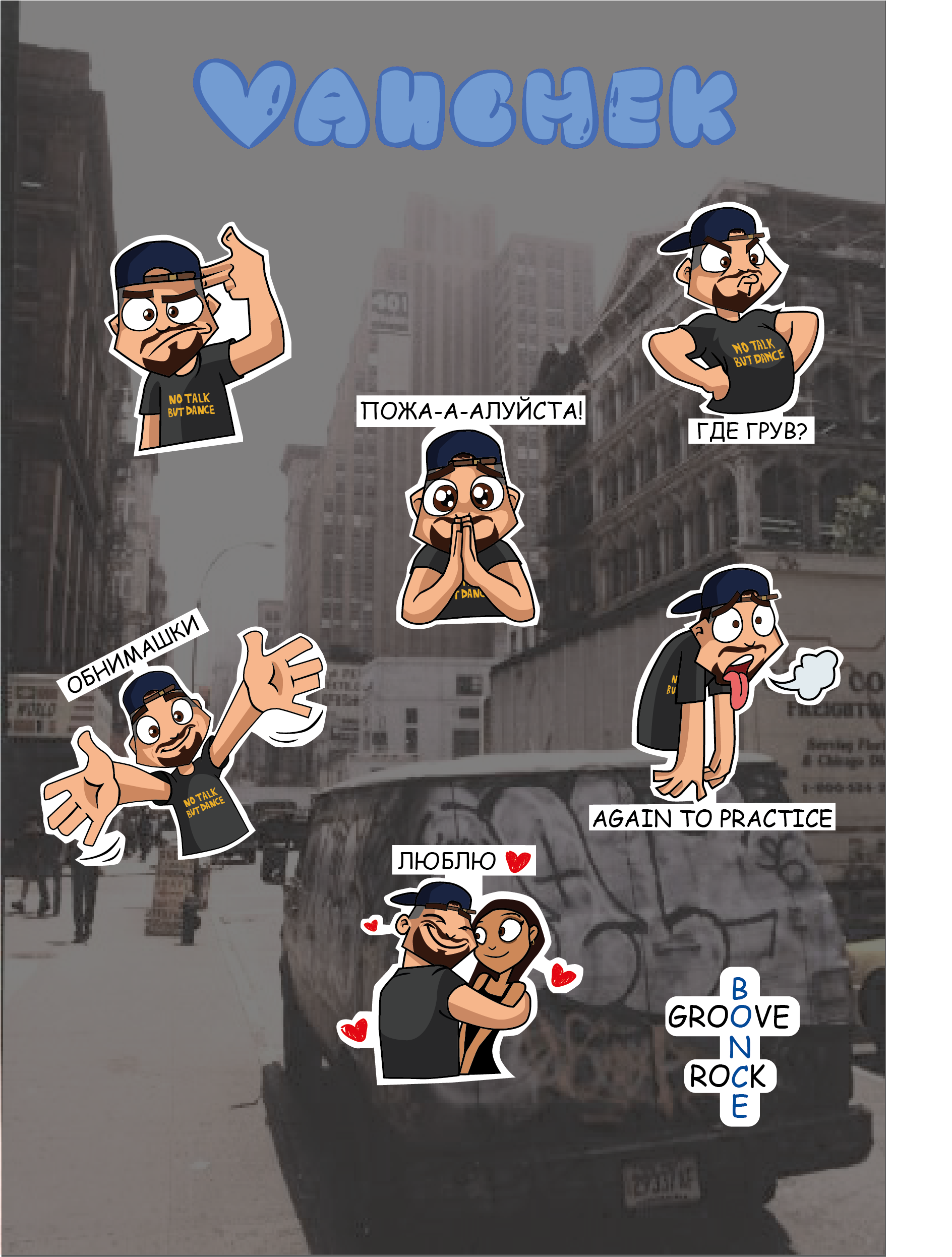 Создала стикеры для своего тренера. Учтены особенности его внешности и предпочтений.