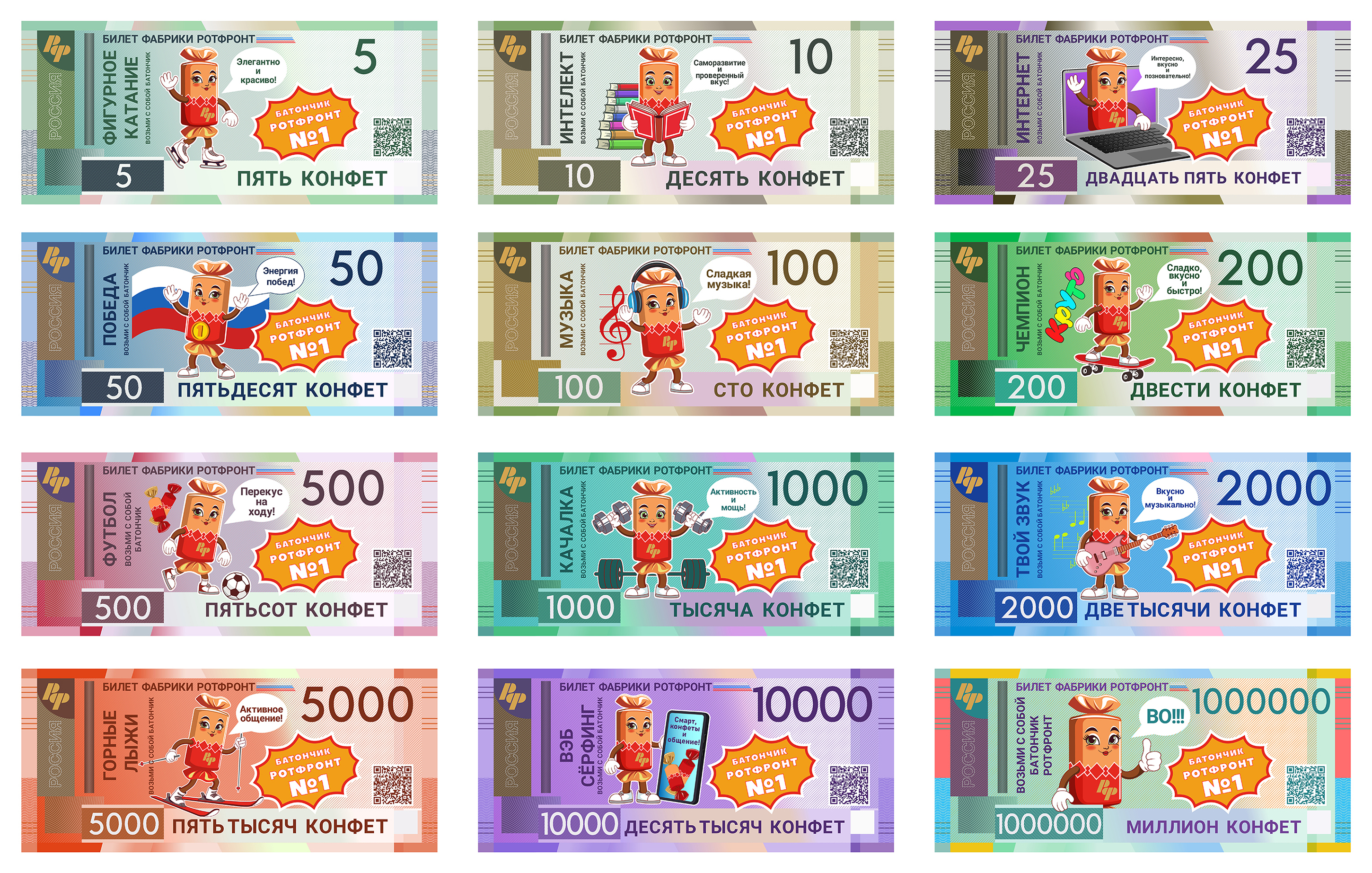 Талисман Конфетка батончик фабрики РотФронт на стилистических банкнотах. Вариант, коллекционные вкладыши для конфет, по типу вкладышей в жевательных резинках. QR-code - это ссылка на сайт фабрики.