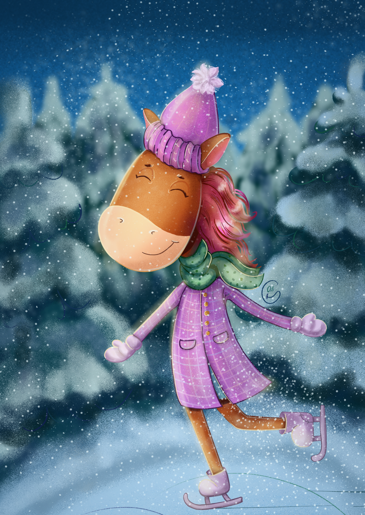 Новогодняя лошадка, катается на коньках, ожидая самый добрый праздник.