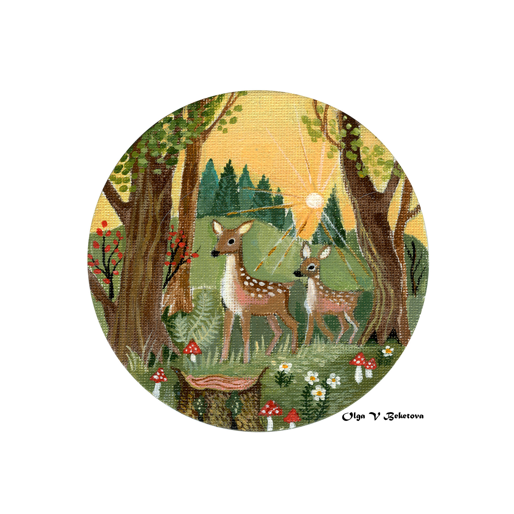 Оленики в вечернем лесу. Магнитик. Размер 10см.