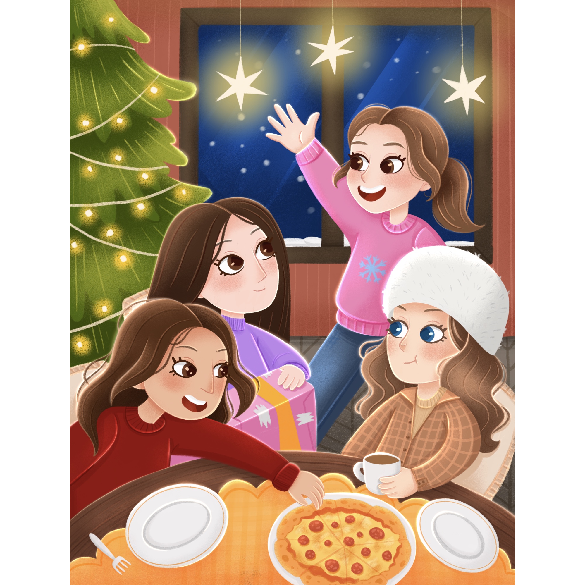 Новогодняя открытка, созданная на основе настоящих людей. Милая сцена, где подружки встретились на Новый год, чтобы обменяться подарками и поговорить.
