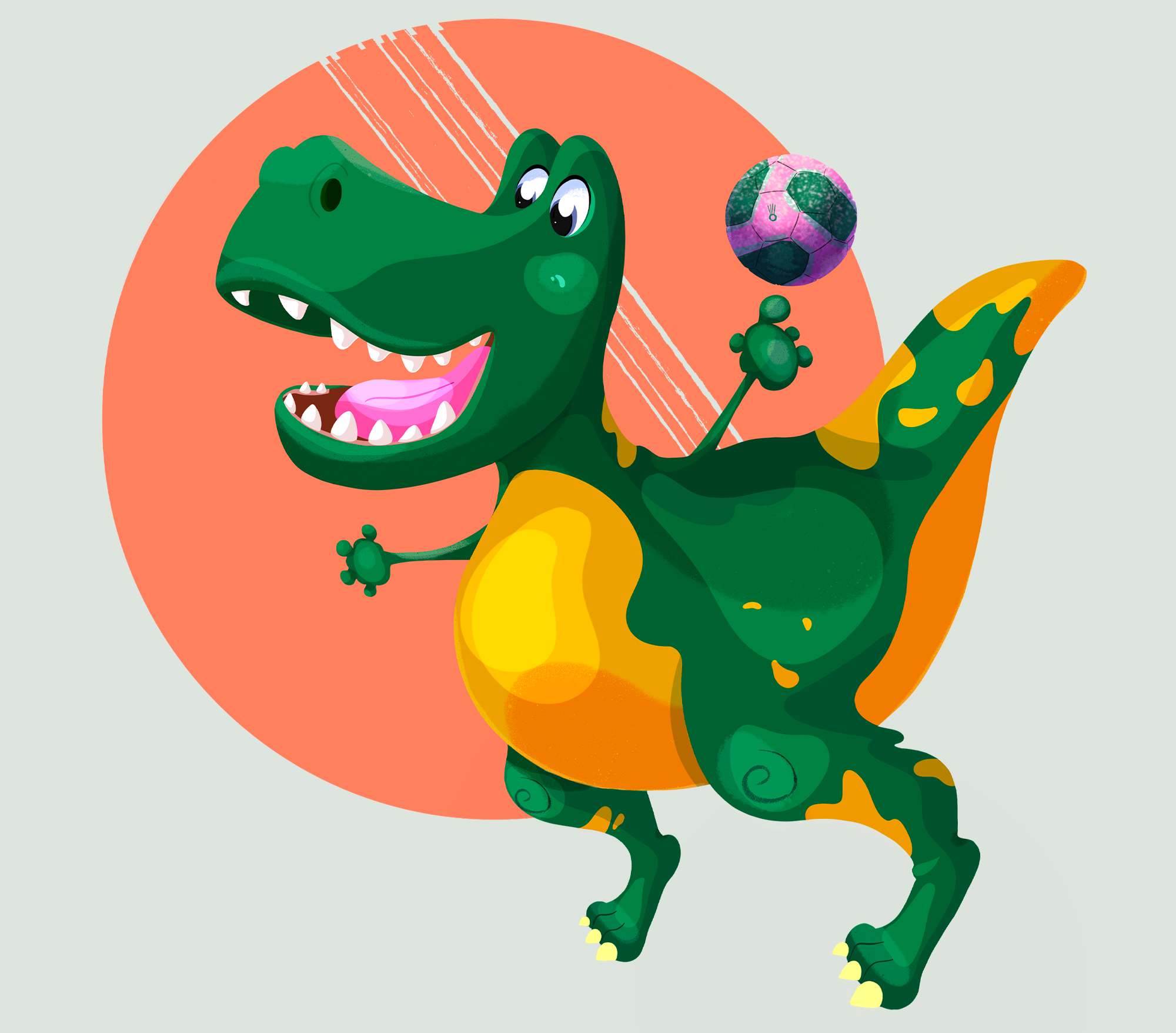 Мультяшный персонаж — тираннозавр в роли игрока в гандбол.