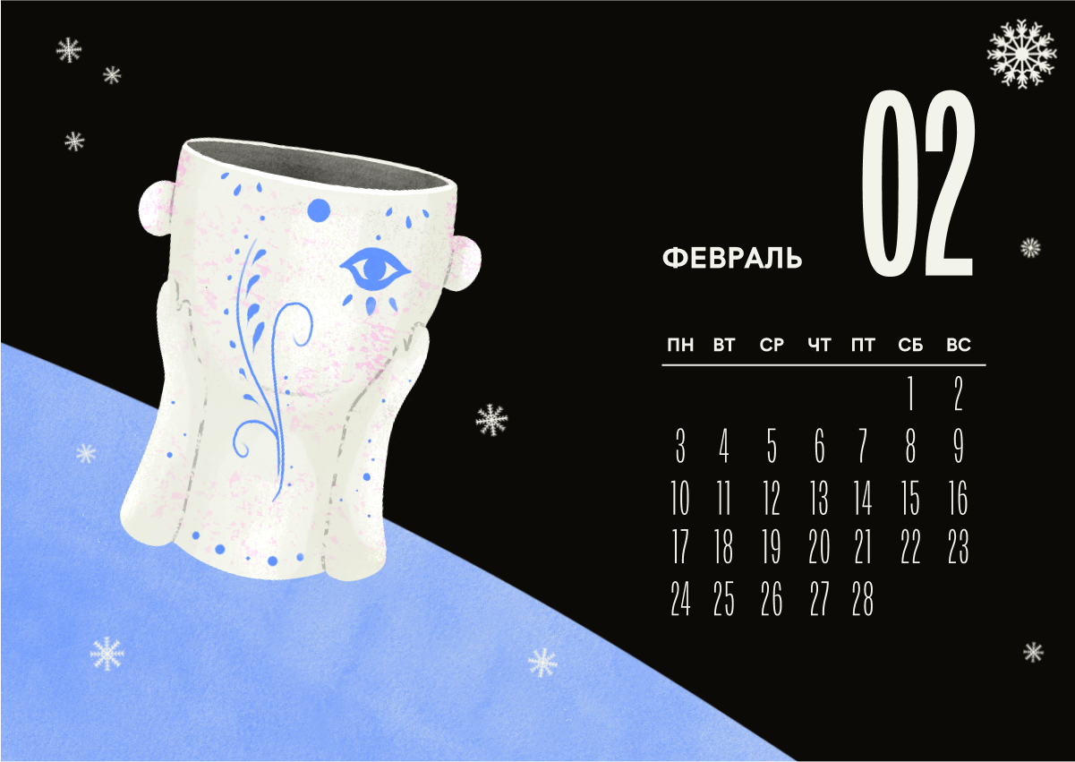Иллюстрация выполнена в декоративном стиле с текстурой и ограниченной цветовой палитрой, как часть авторского календарного проекта.