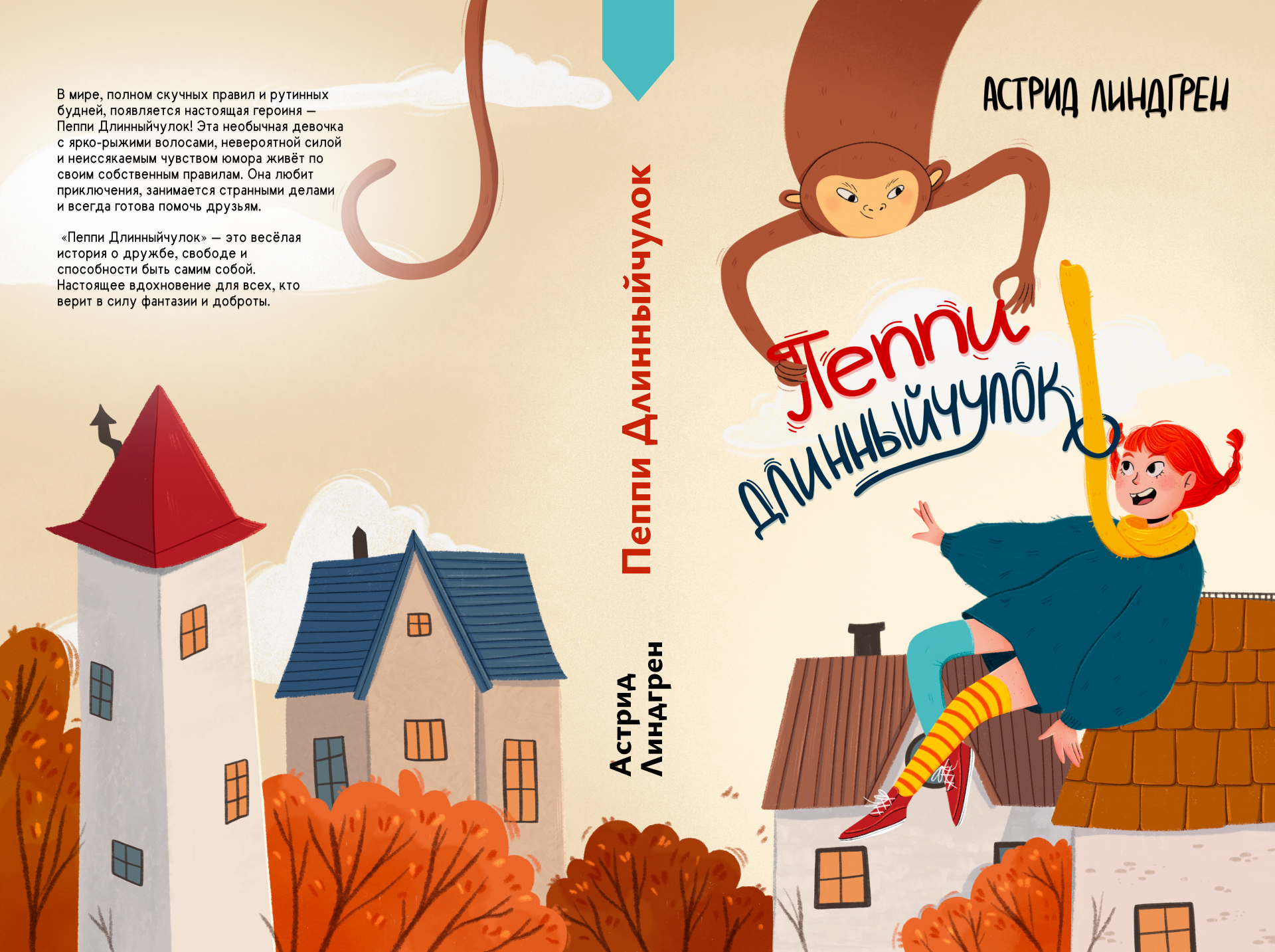 Очаровательная иллюстрация к знаменитой книге Астрид Линдгрен «Пеппи Длинныйчулок»! В центре композиции — сама Пеппи: озорная девочка с ярко-рыжими волосами, в полосатых чулках и ярком наряде, будто парящая над крышами домов. Рядом с ней — её верный друг, забавная обезьянка, которая добавляет сцене ещё больше шарма и динамики.