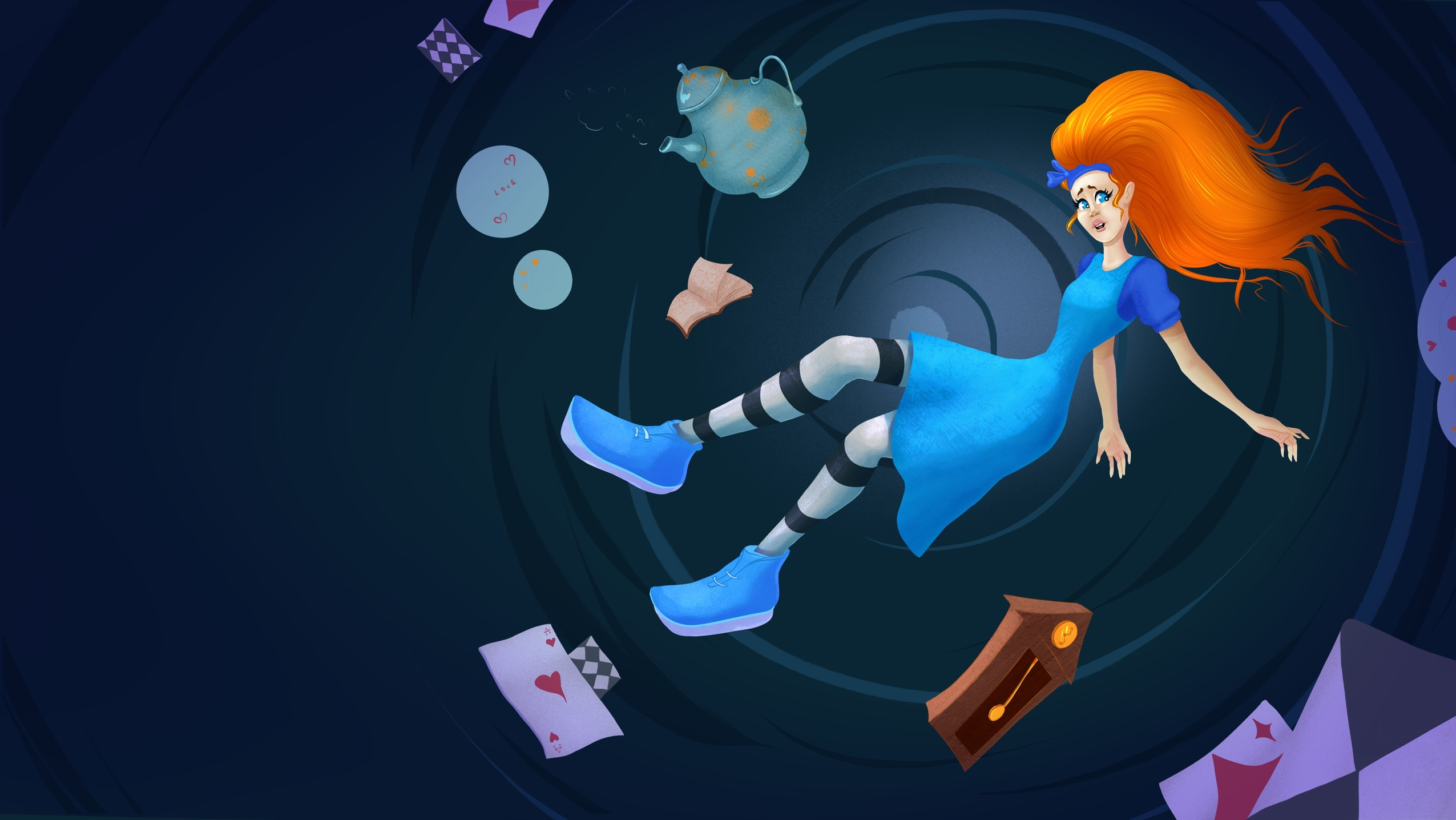 Алиса словно зависла между мирами: вокруг кружатся предметы, время замедляется, а пространство закручивается в воронку. Это мгновение удивления, лёгкого страха и предвкушения чуда — когда ещё неизвестно, что ждёт впереди, но назад пути уже нет.