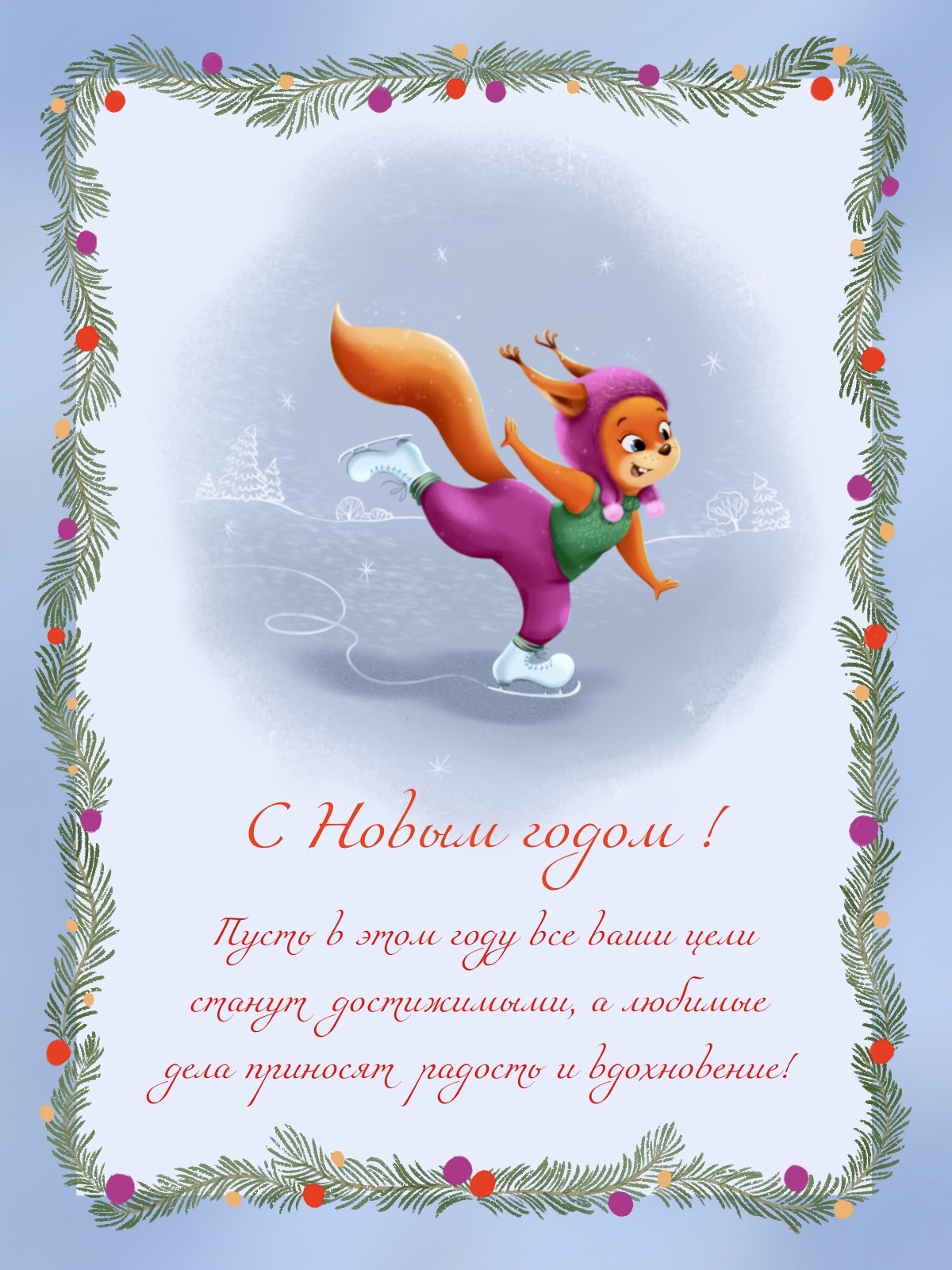 Новогодняя открытка с белочкой фигуристкой и новогодним поздравлением