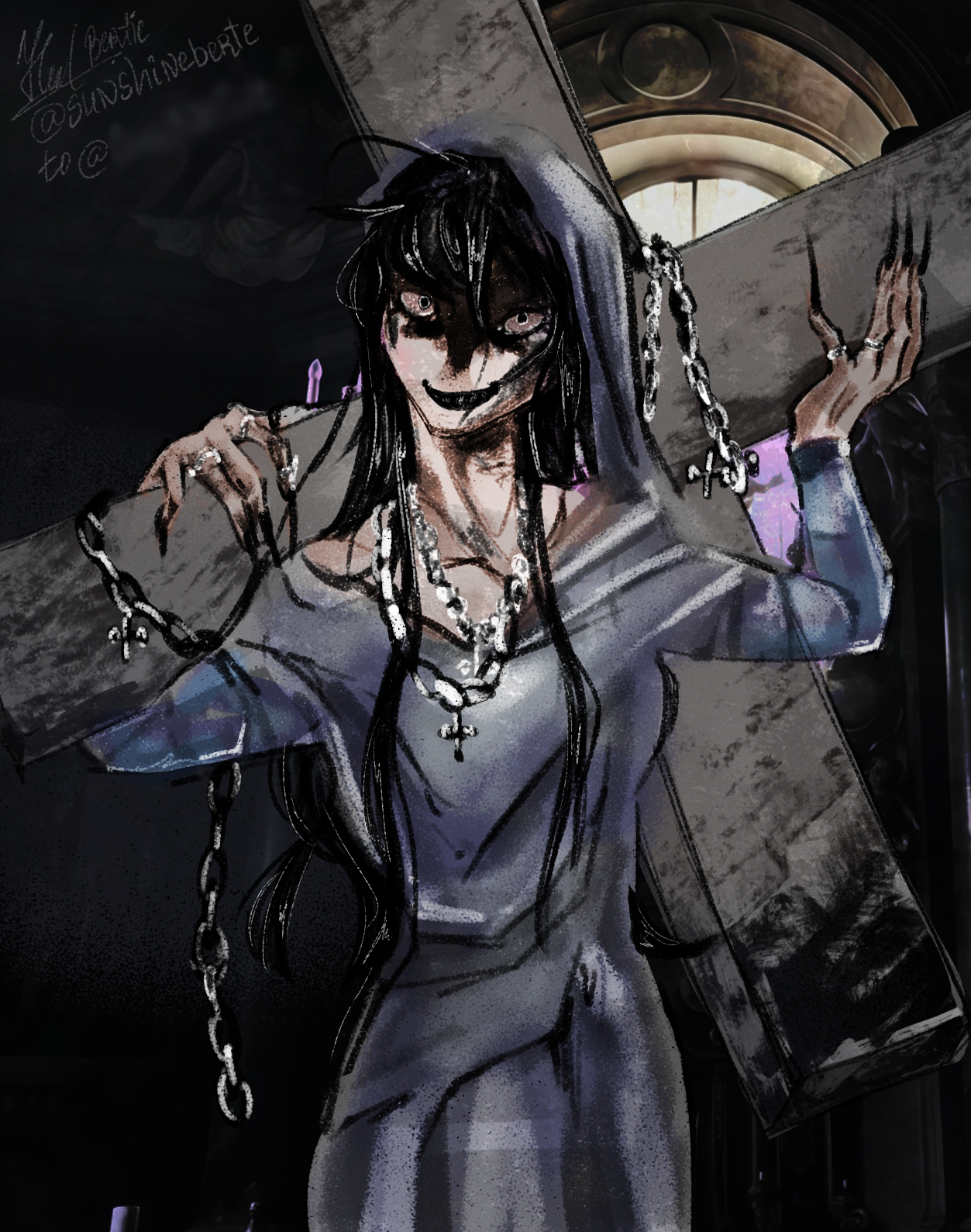 Заказчик прислал несколько референсов, которыми вдохновлялся, и тема показалась мне интересной. Я никогда не рисовала таких мрачных картин, но моей задачей было сделать нечто психоделичное и наводящее ужас. Запрос звучал как: девушка должна держать на плечах крест, прогибаться под его тяжестью. В ходе диалога были додуманы подробности: длинные черные волосы, улыбка, обнажабщая черные зубы, длинные ногти, готический собор в качестве фона. Получила заказ утром, готовую работу отправила этим же вечером. Заказчик разрешил добавить рисунок в портфолио🧡