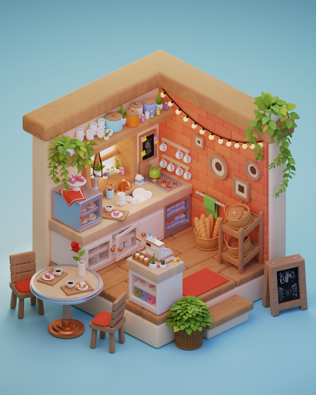 Милая изометрическая кофейня сделаная полностью в программе Blender