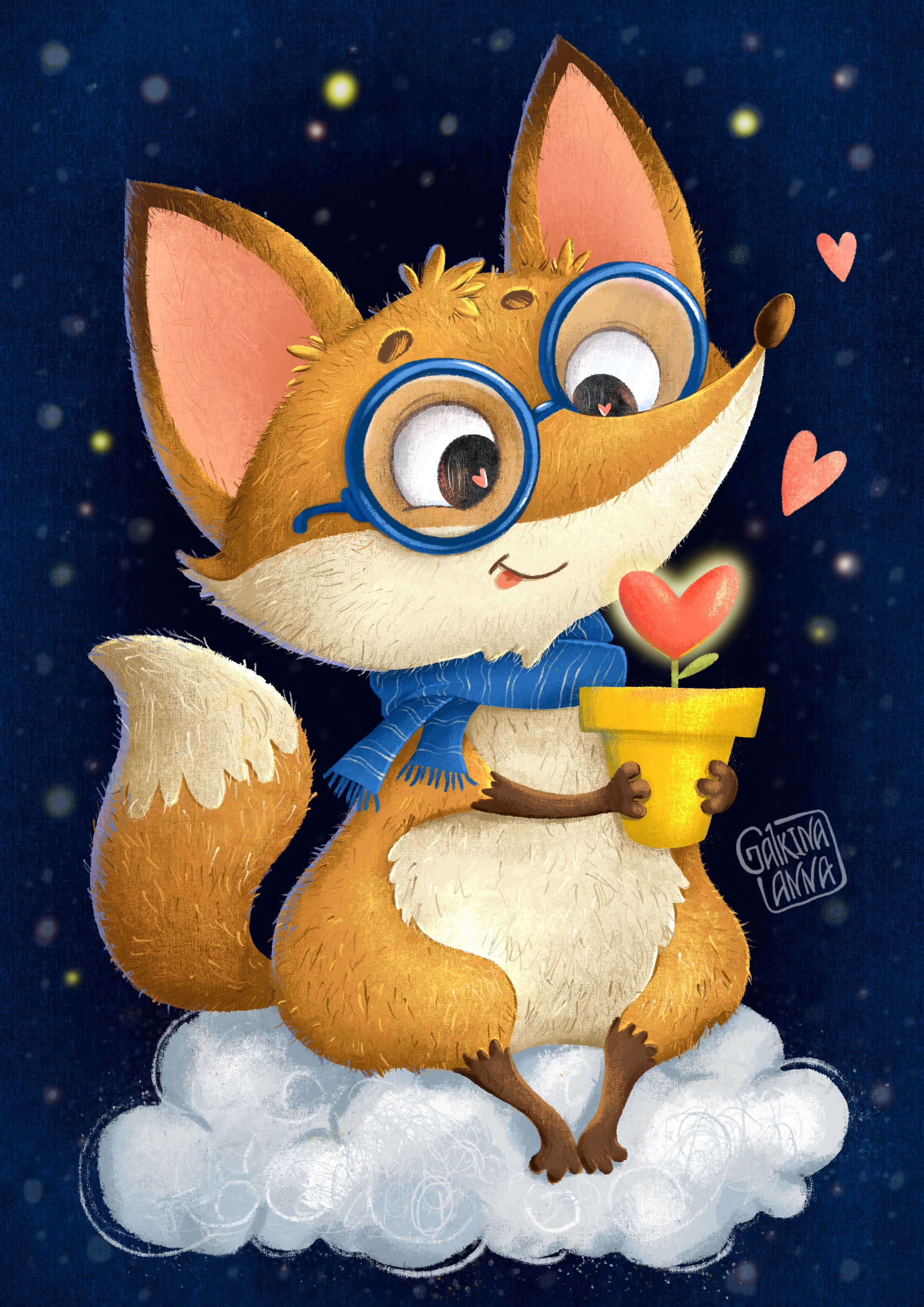 Иллюстрация по мотивам АС Экзюпери "Маленький принц", но уже лисенок бережно и заботливо выращивает свою "розу". Тема бесконечности его любви, глубины чувства передается так же с помощью фона (Вселенной). Цвета выбраны контрастные - желто-синяя гамма.