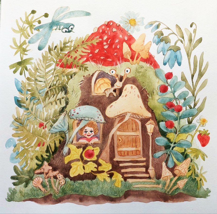 Лесная фея и улитка живут в домике. Домик-пень, вокруг которого растут ягоды, грибы, цветы