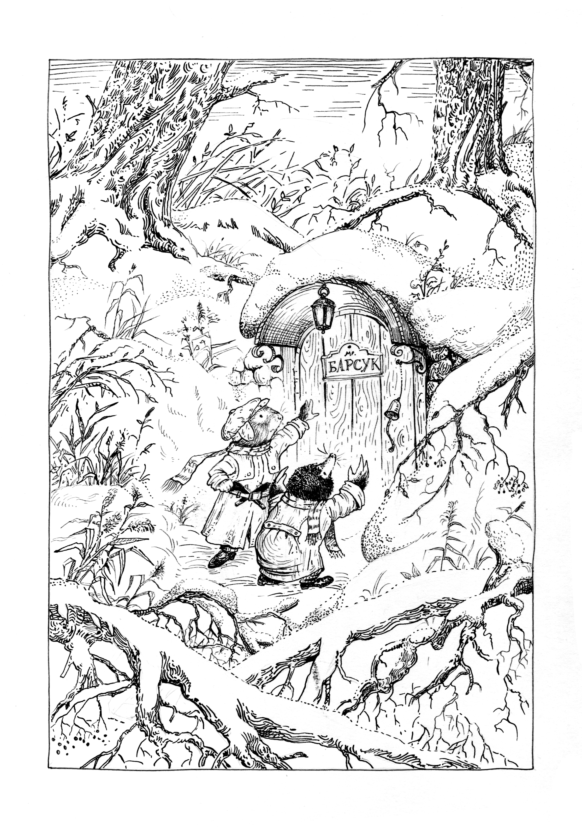 Минут десять усердной работы, и дубинка наткнулась на что-то, что отозвалось пустотой. Рэт копал до тех пор, пока не сумел просунуть лапу и пощупать, потом попросил Крота, чтобы он подошел помочь ему. Оба зверя стали изо всех сил копать и копали до тех пор, пока даже Кроту не стало ясно, зачем они это делали. В том, что казалось на первый взгляд сугробом, обнаружилась крепкого вида дверь, выкрашенная в темно-зеленый цвет. Сбоку висела железная петля звонка, а чуть ниже была укреплена небольшая медная табличка, на которой была красивыми, аккуратными буквами выгравирована надпись, которую они прочли при свете луны:
