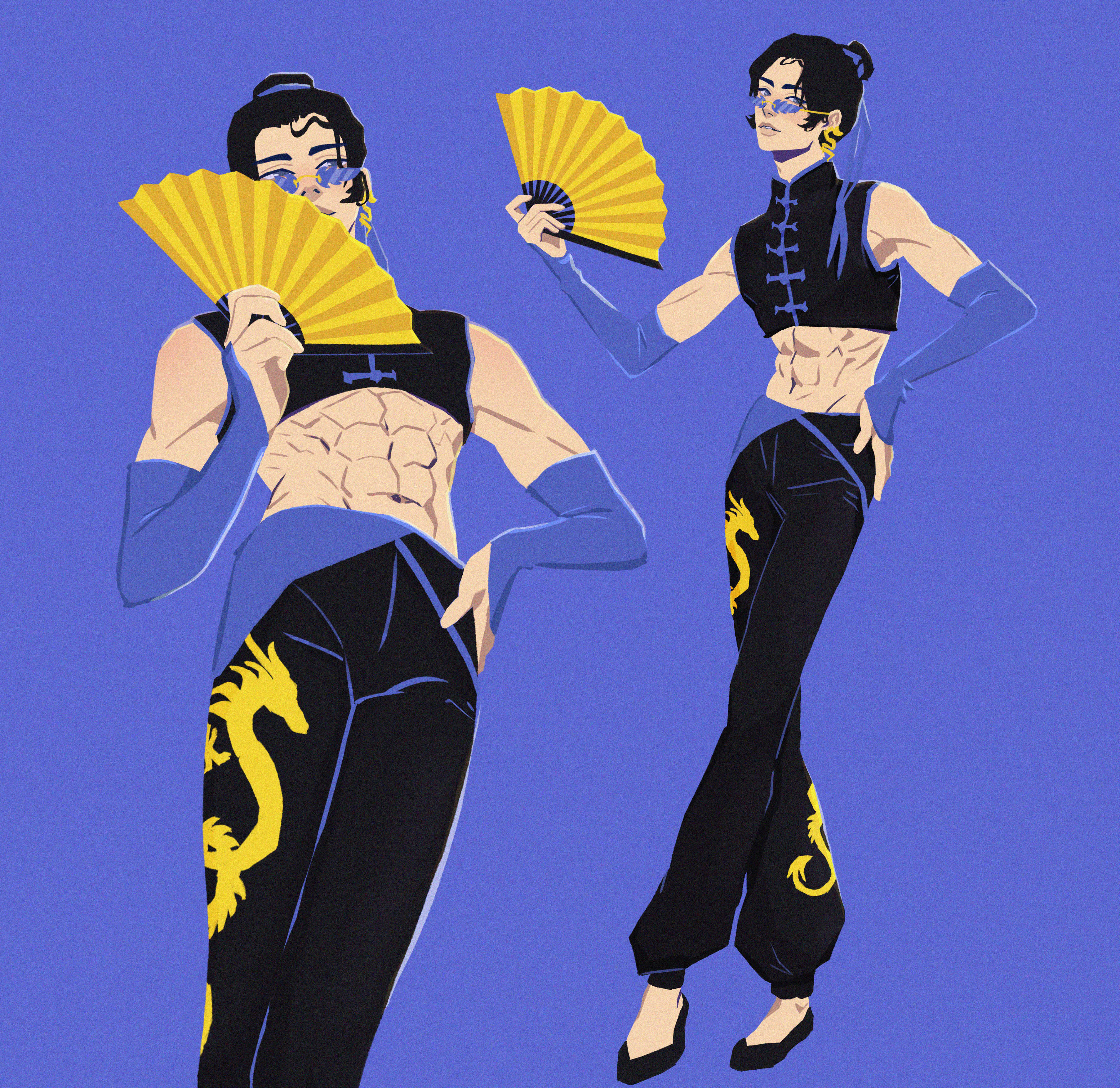 Стилизованный дизайн персонажа с акцентом на силуэт, позу и одежду.