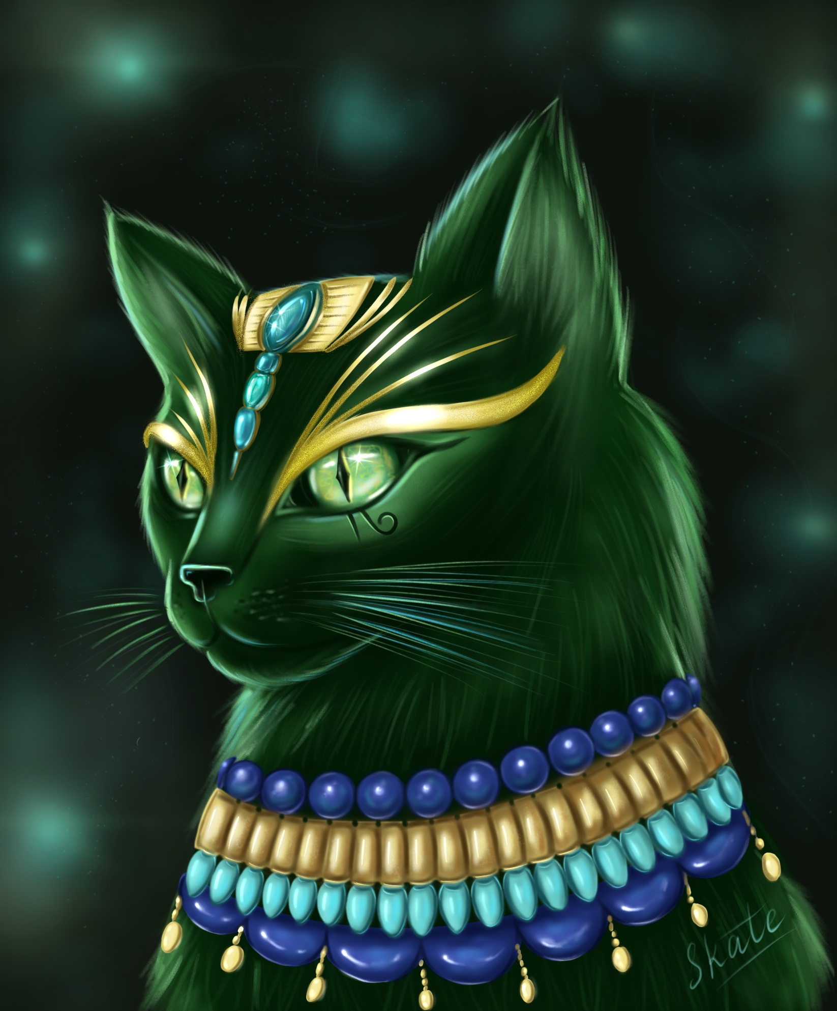 Мифологическая изумрудная кошка. Цифровая иллюстрация, Procreate.