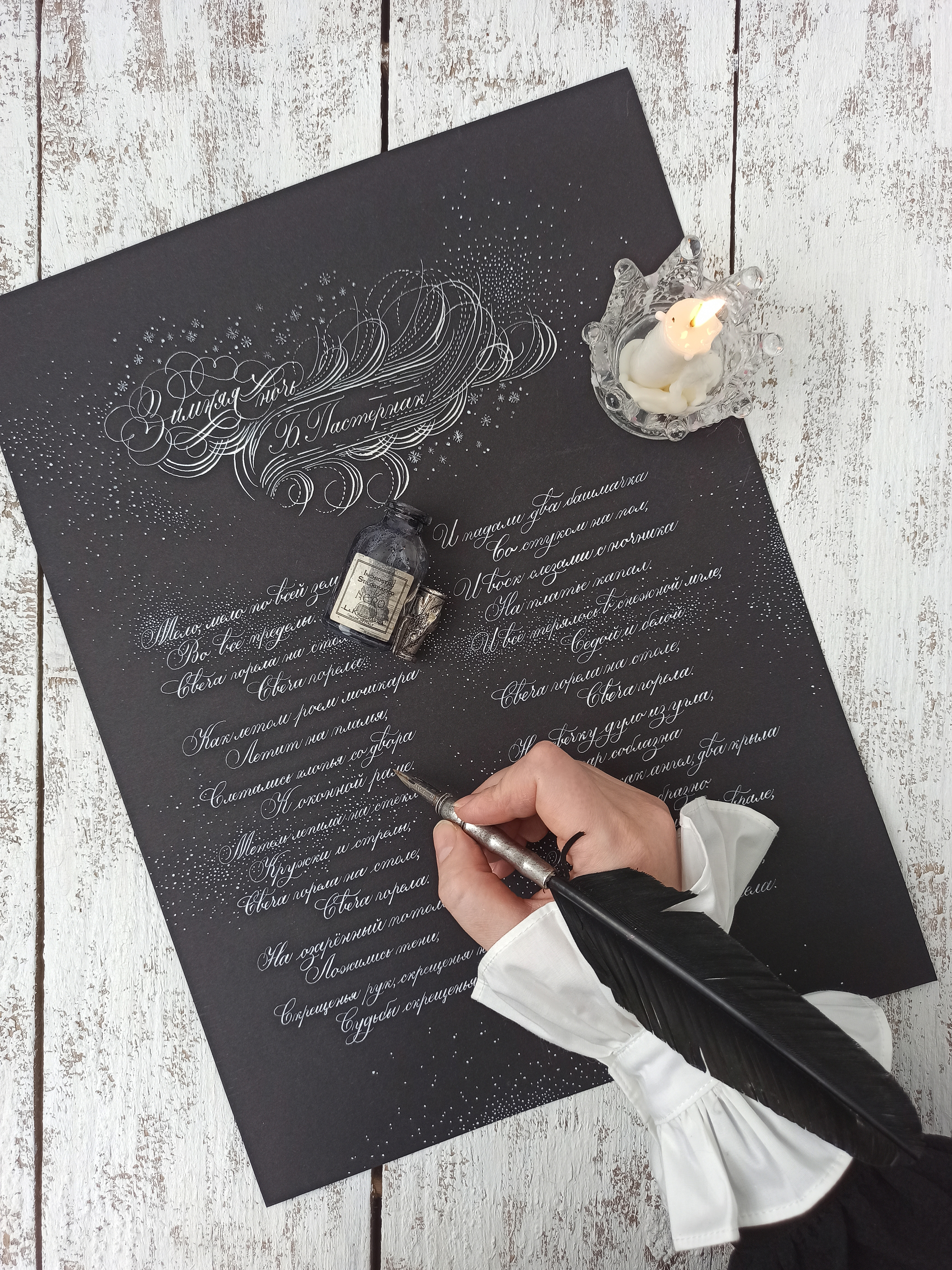 Каллиграфия остроконечным пером со стихотворением Б. Пастернака "Зимняя ночь".