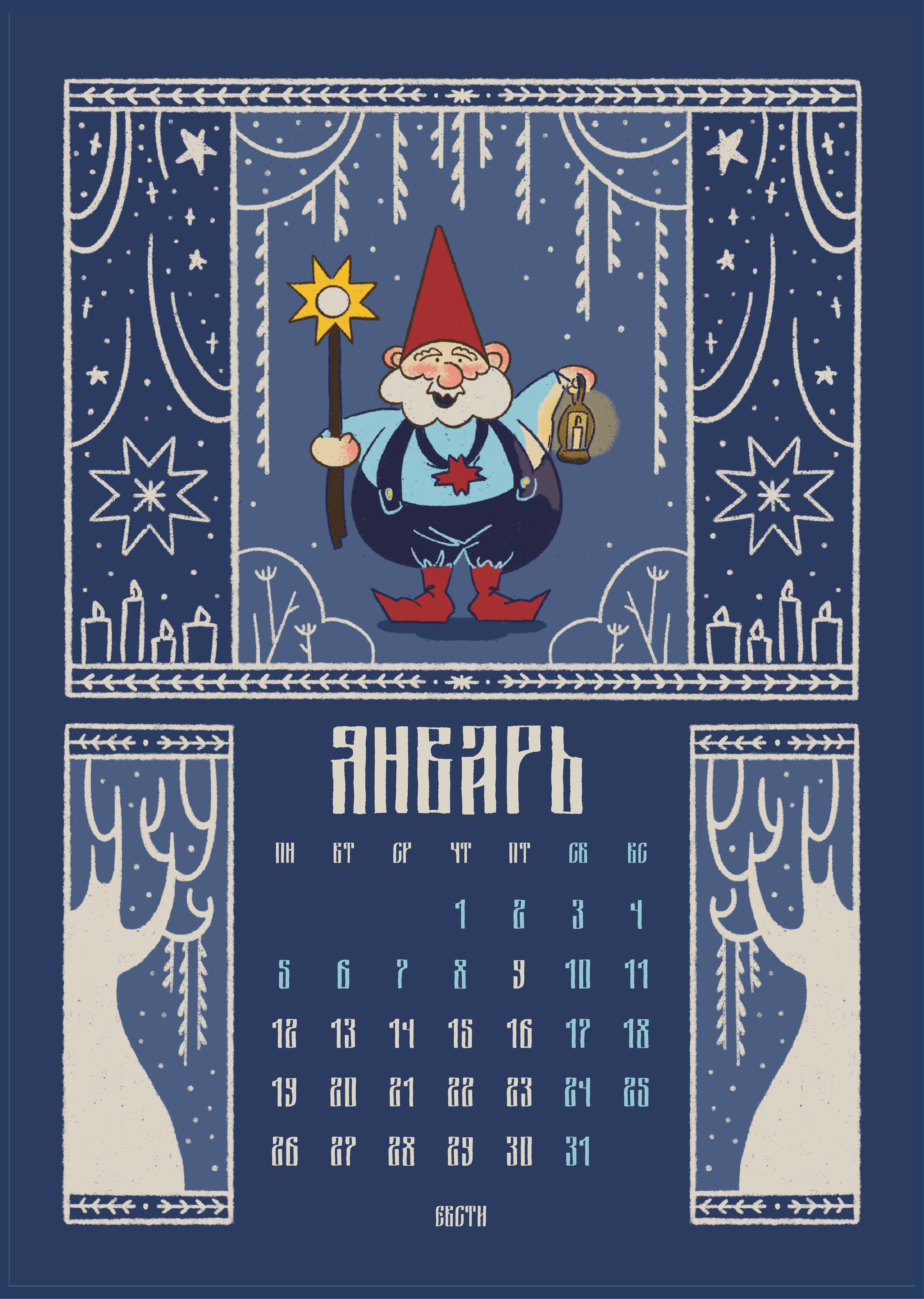 иллюстрация января: гномик Коляда. он охраняет дома в рождество и задаёт настроение праздника колядующим