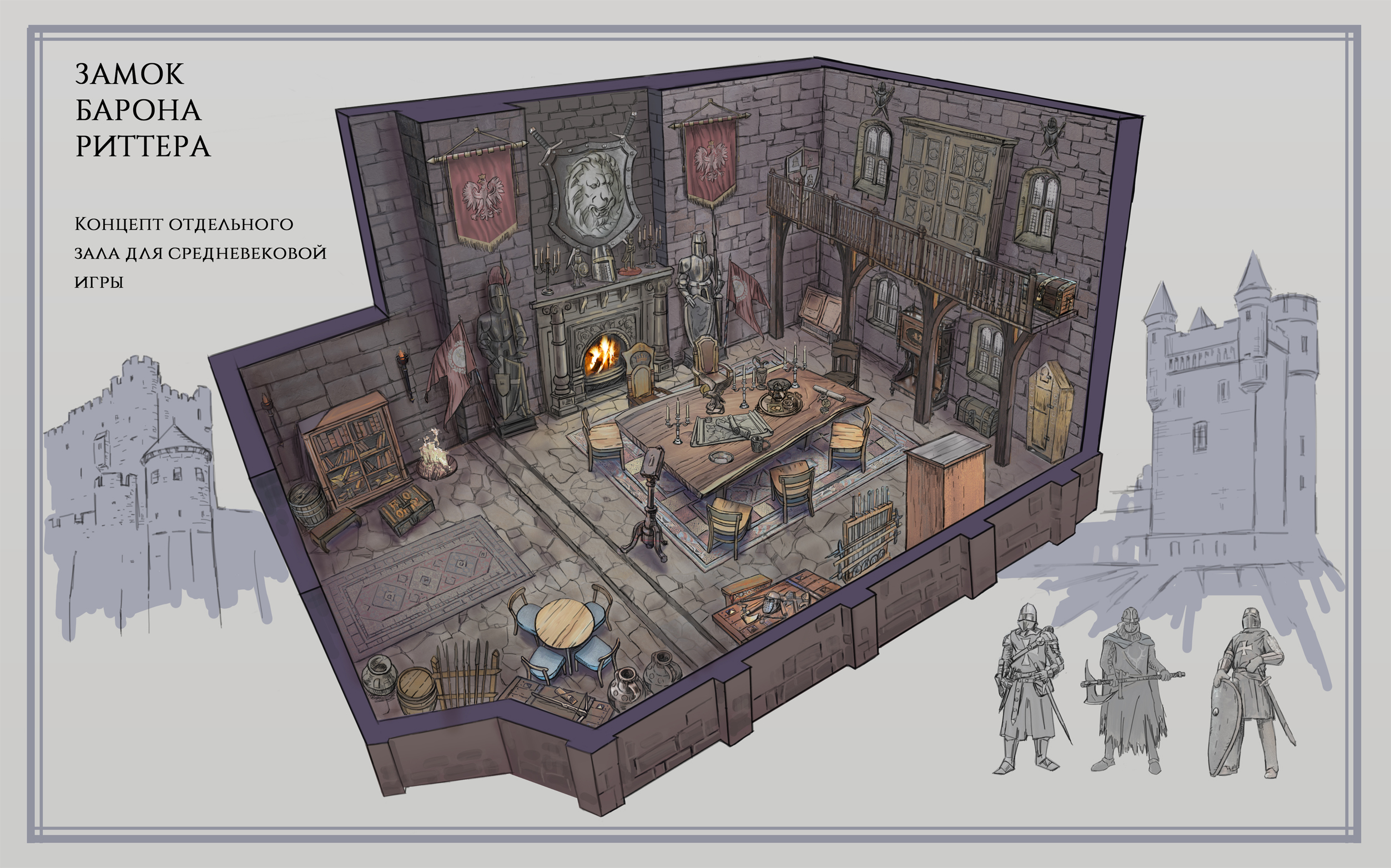 Концепт арт зала замка, выполнен для компьютерной игры. The concept of the castle's art room is made for a computer game.