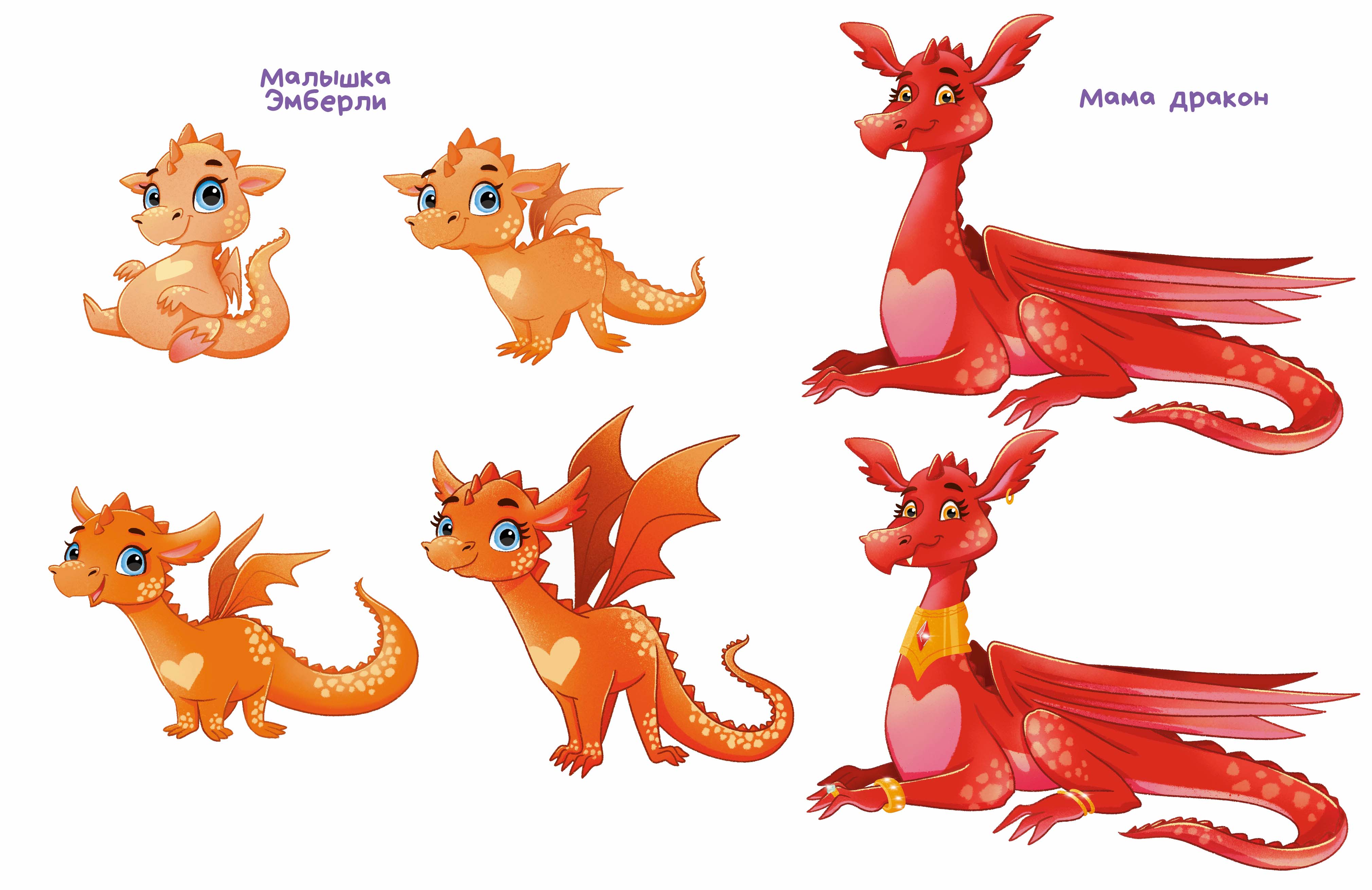 Дизайн персонажей к книге "Малыш Дракон". Малышка-дракон Эмберли постепенно растёт и меняет свой цвет на более яркий на протяжении всей книги. Также её характер и поведение похоже на поведение щенка. поэтому я придумала драконам в этой книге большие уши, какие бывают у собак.