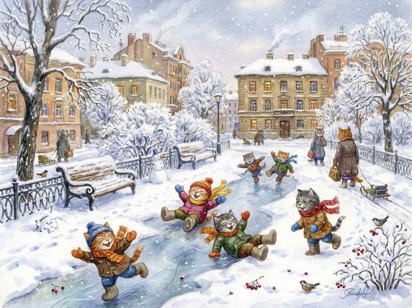 Зимнее утро, выходной. Котята раскатали ледянку на дорожке в сквере. Прокатились бы?
