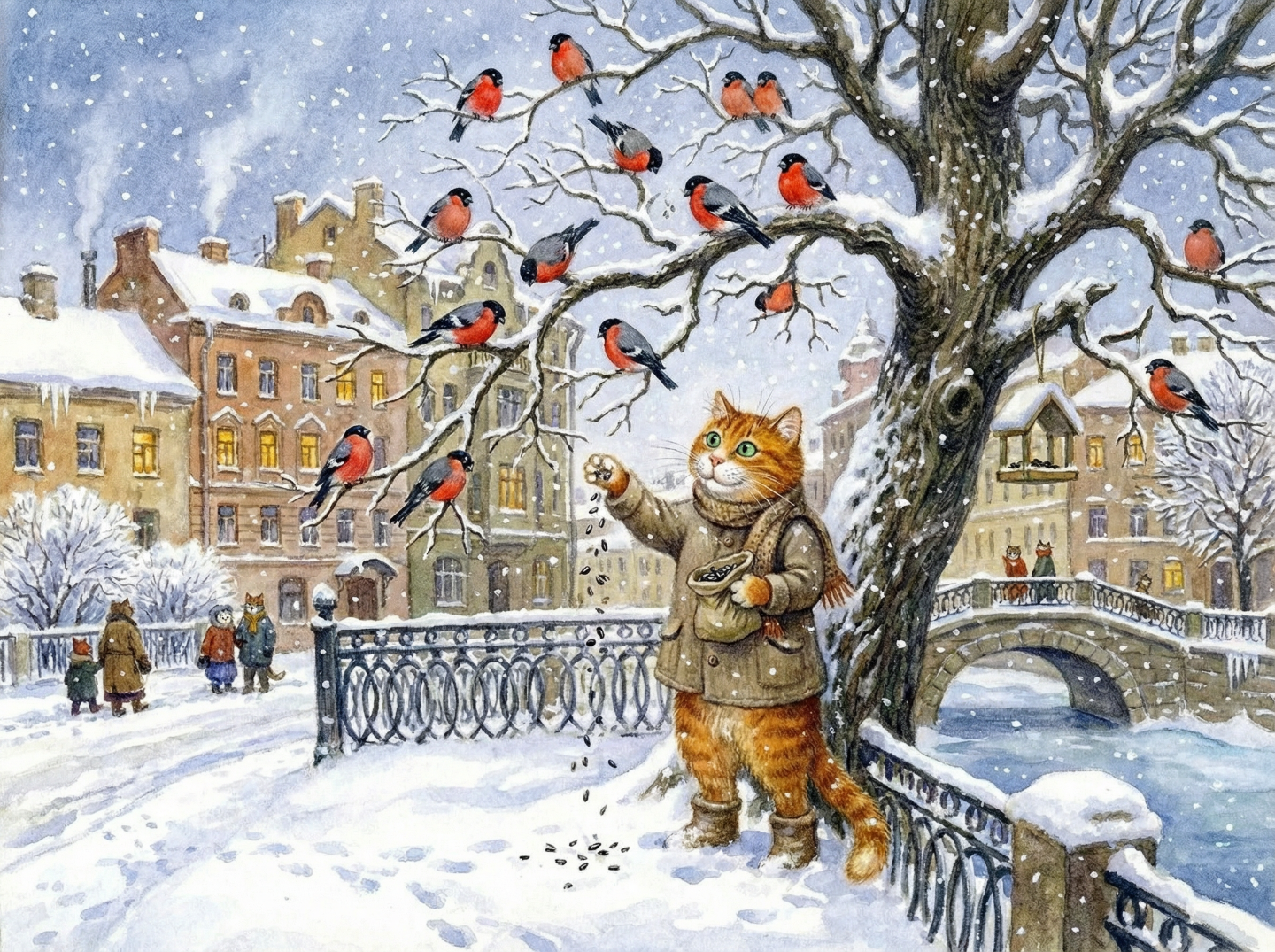 Птицы зимой очень украшают город, особенно радует, когда прилетают снегери! Удивительные и нарядные птички. Сегодня утром кот Евстигней специально зашёл и купил в овощной лавке кулёк семечек, чтобы посыпать в парке.