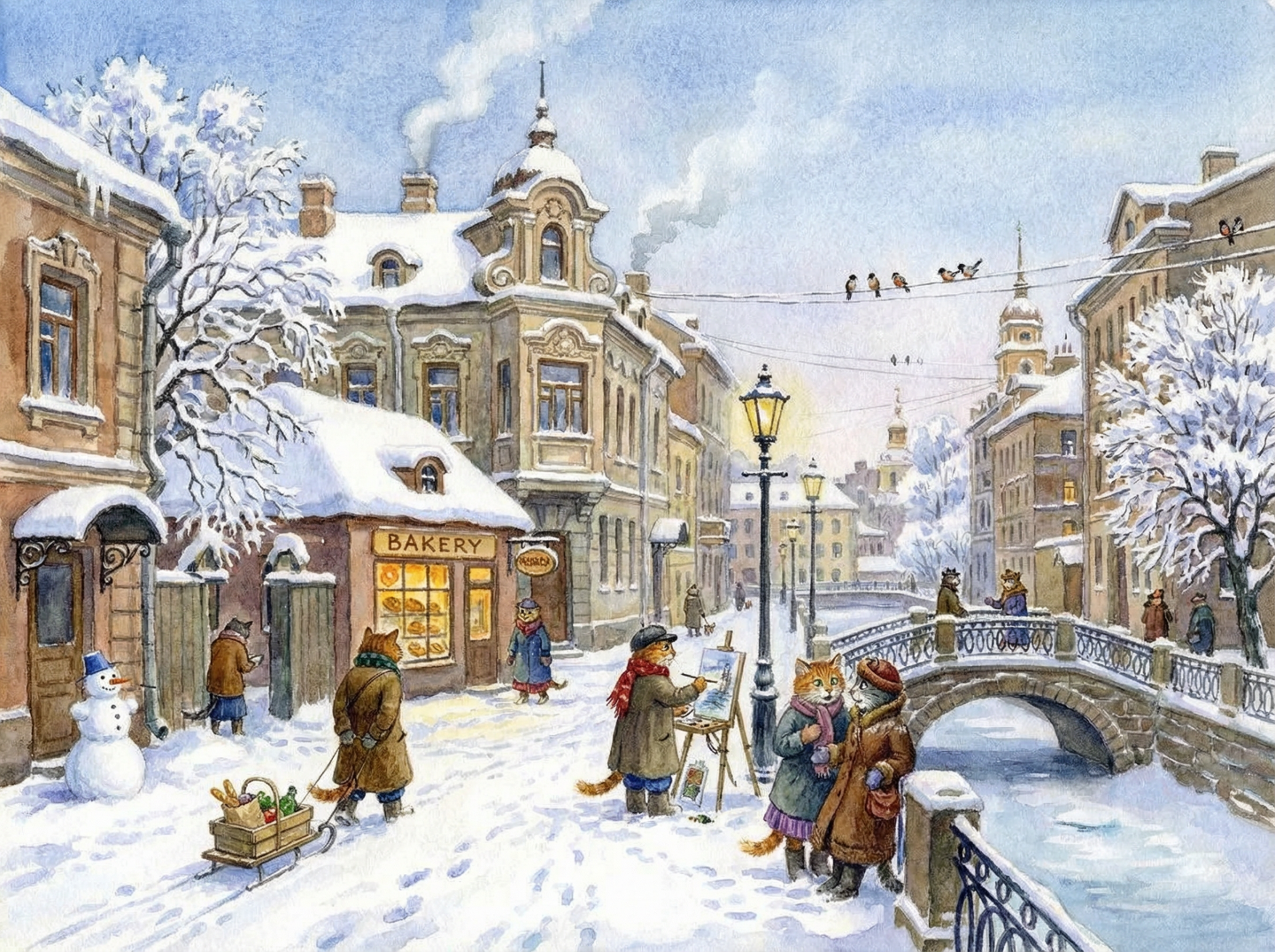 Тихо падает легкий снежок, снег скрипит под валенками. Самое время выйти на этюд, жаль краски замерзают, приходится отогревать под курткой. Сосед идёт с рынка с санками. Тоже потом схожу. Пахнет свежей выпечкой из кофейни. Может пирожок с рыбкой?