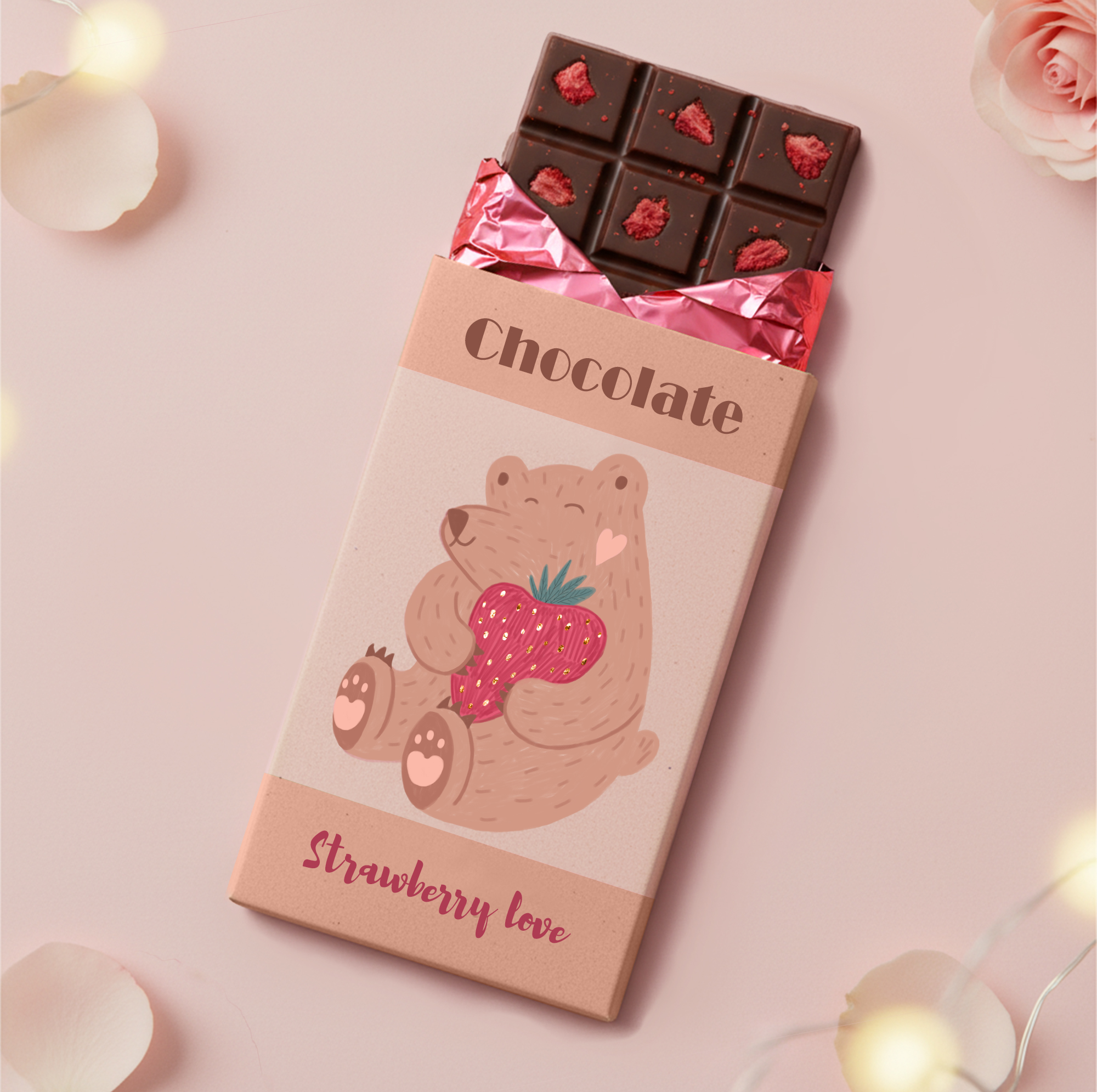Довольный мишка с любимой клубничкой, для упаковки шоколада. Серия иллюстраций ко Дню Святого Валентина
