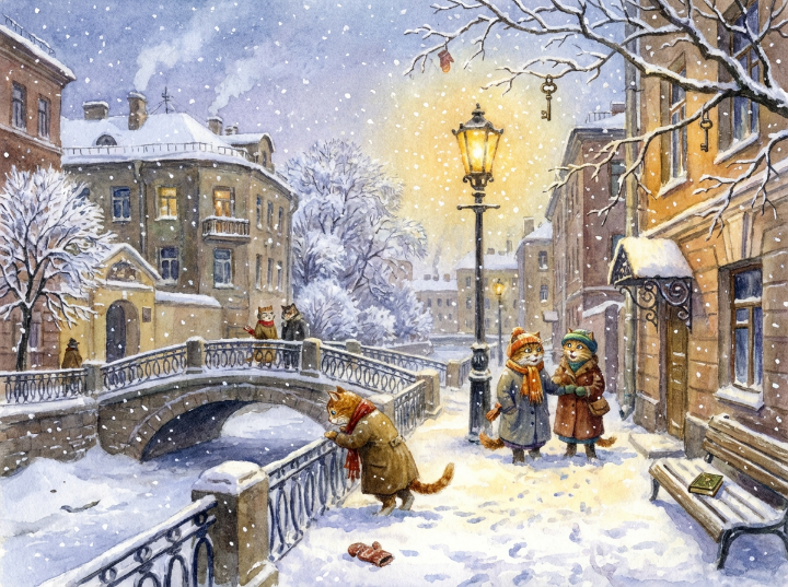 Тихий зимний вечер, коты гуляют по набережной