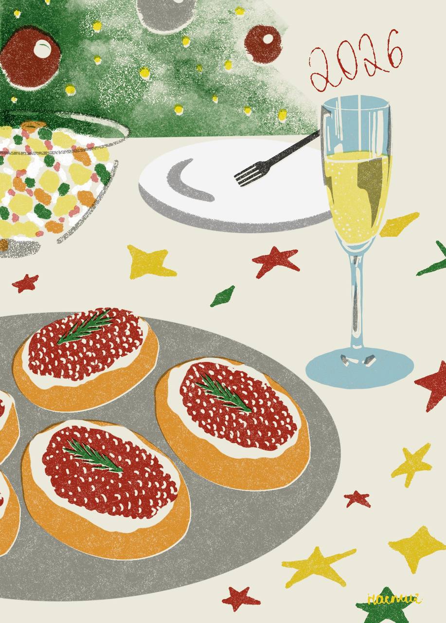 Классика праздника: бутерброды с красной икрой, оливье в миске, бокал шампанского и ёлка на фоне. Тёплые тона, уютная атмосфера семейного вечера. Рисовала с любовью к традициям и вкусу детства. В стиле ризографии