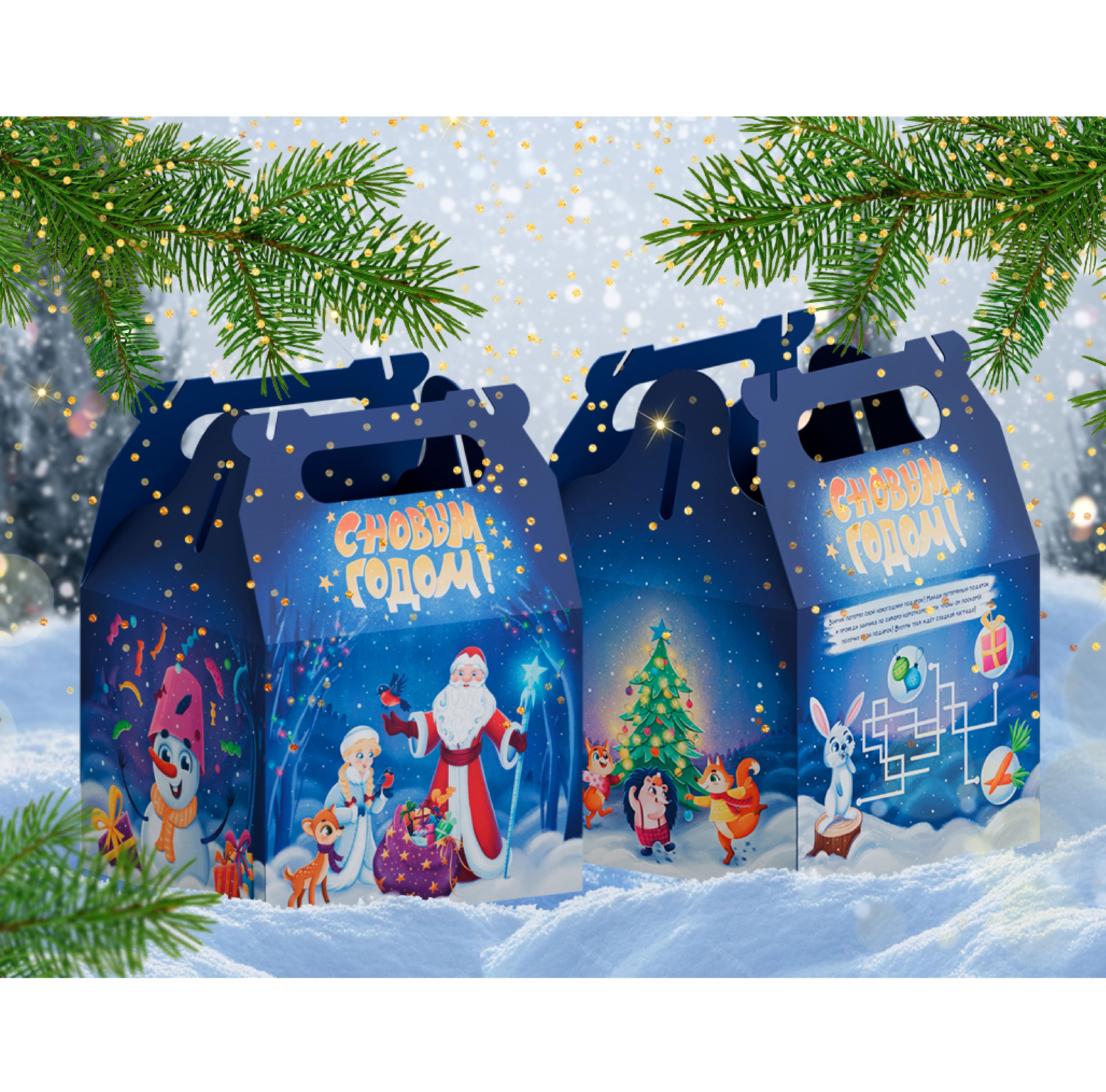 Это не просто рисунок на коробке — это окно в волшебный лес, где уже начался праздник. Добрый Дедушка Мороз и улыбчивая Снегурочка собрали вокруг себя лесную детвору, чтобы вместе порадоваться самому тёплому празднику. Кажется, вот-вот послышится хруст снега, смех и шелест фантика. Я рисовала эту сцену, чтобы сладости внутри стали частью настоящей новогодней сказки.