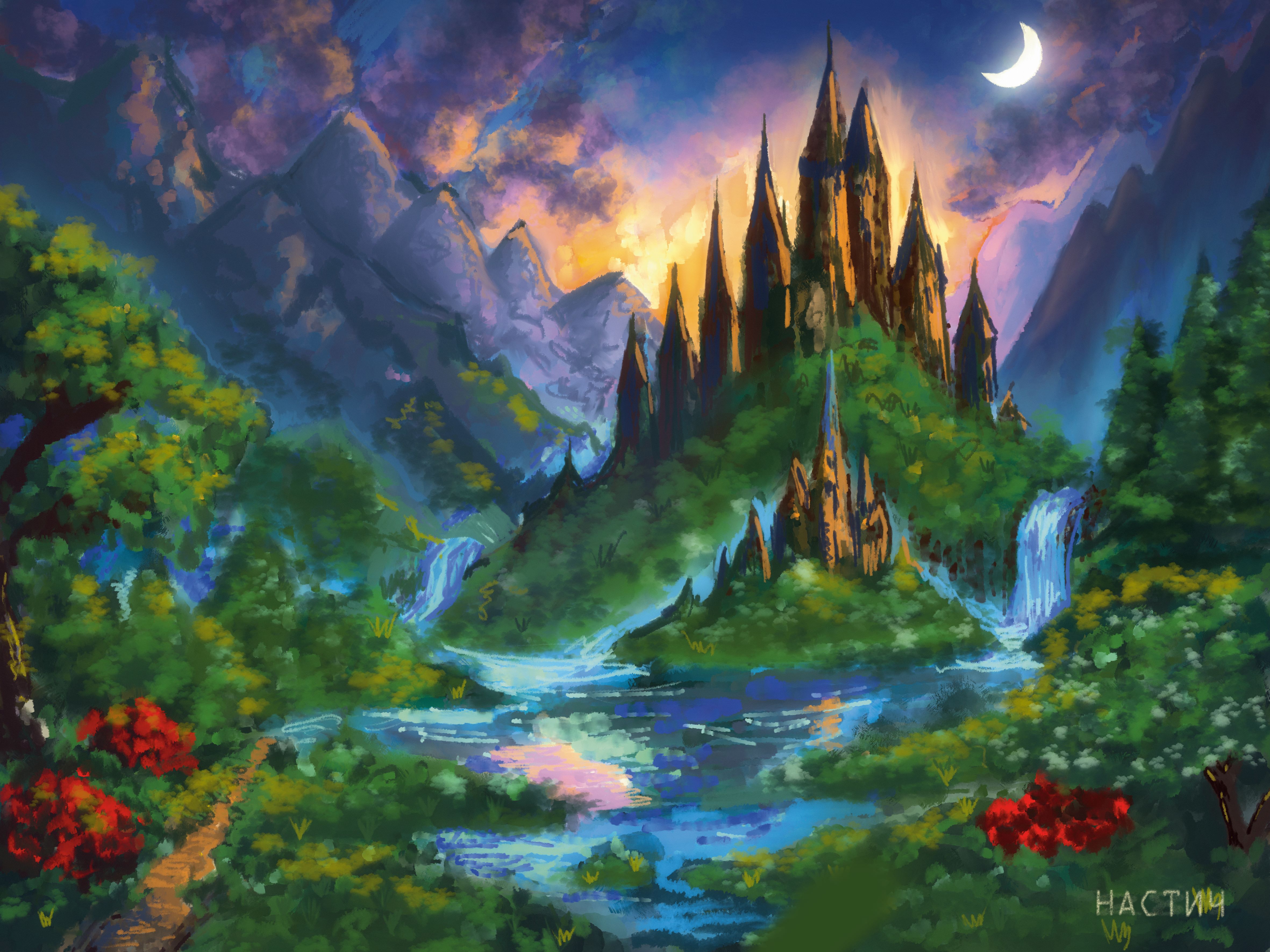 Фэнтези-пейзаж. Замок в окружении гор и водопадов под закатным небом. Тёплое оранжево-розовое свечение, глубокий синий сумрак и мягкие мазки создают ощущение сказки и покоя. Ручная работа в Procreate с акцентом на свет, атмосферу и текстуру. Для тех, кто ищет место, где можно спрятаться от реальности
