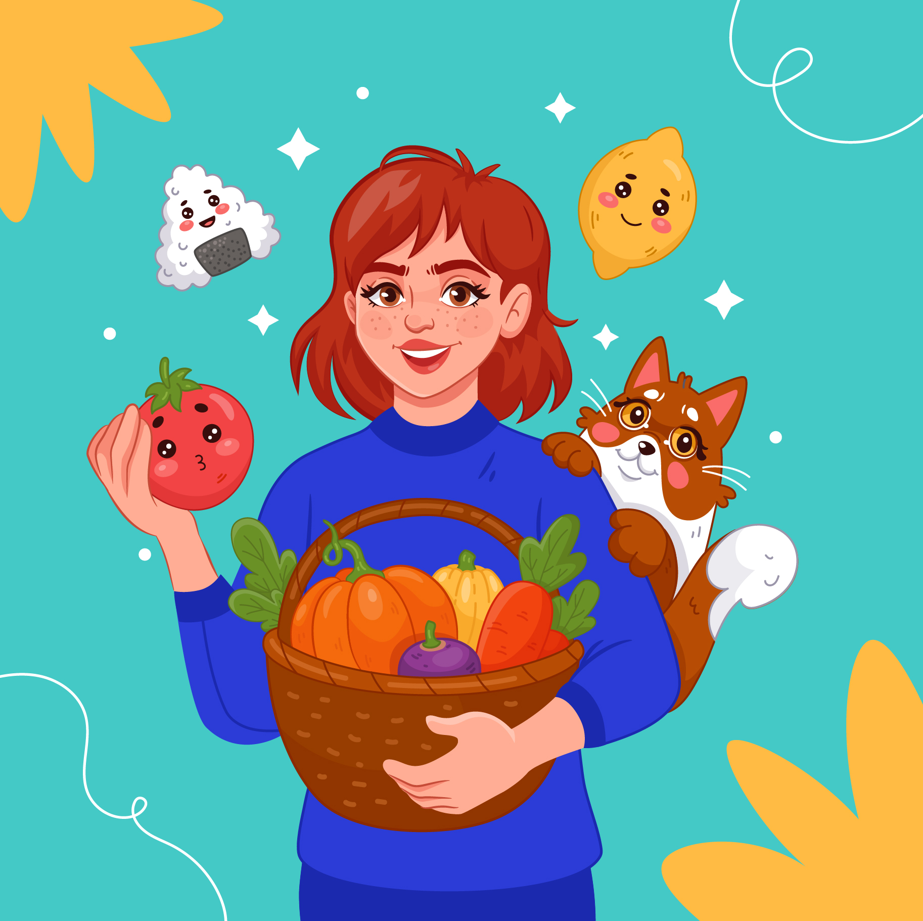 Персонаж с урожаем и милыми продуктами, иллюстрация для детских и lifestyle-проектов