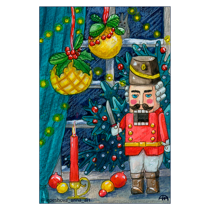 Акварельная новогодняя открытка с интерьерным настроением. Щелкунчик, свечи и ёлочные украшения на подоконнике на фоне ночного окна и мягкого света гирлянды.