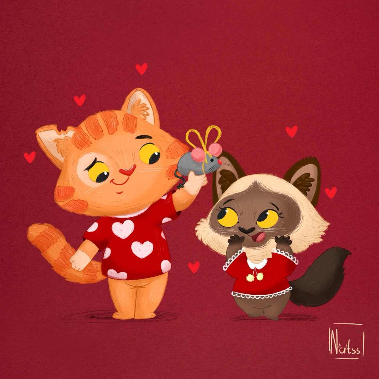 Решила, что у котиков тоже должен быть свой праздник.Вот, нарисовала, как один дарит другому свою заветную игрушку на 14 февраля. Просто, мило и по-домашнему.