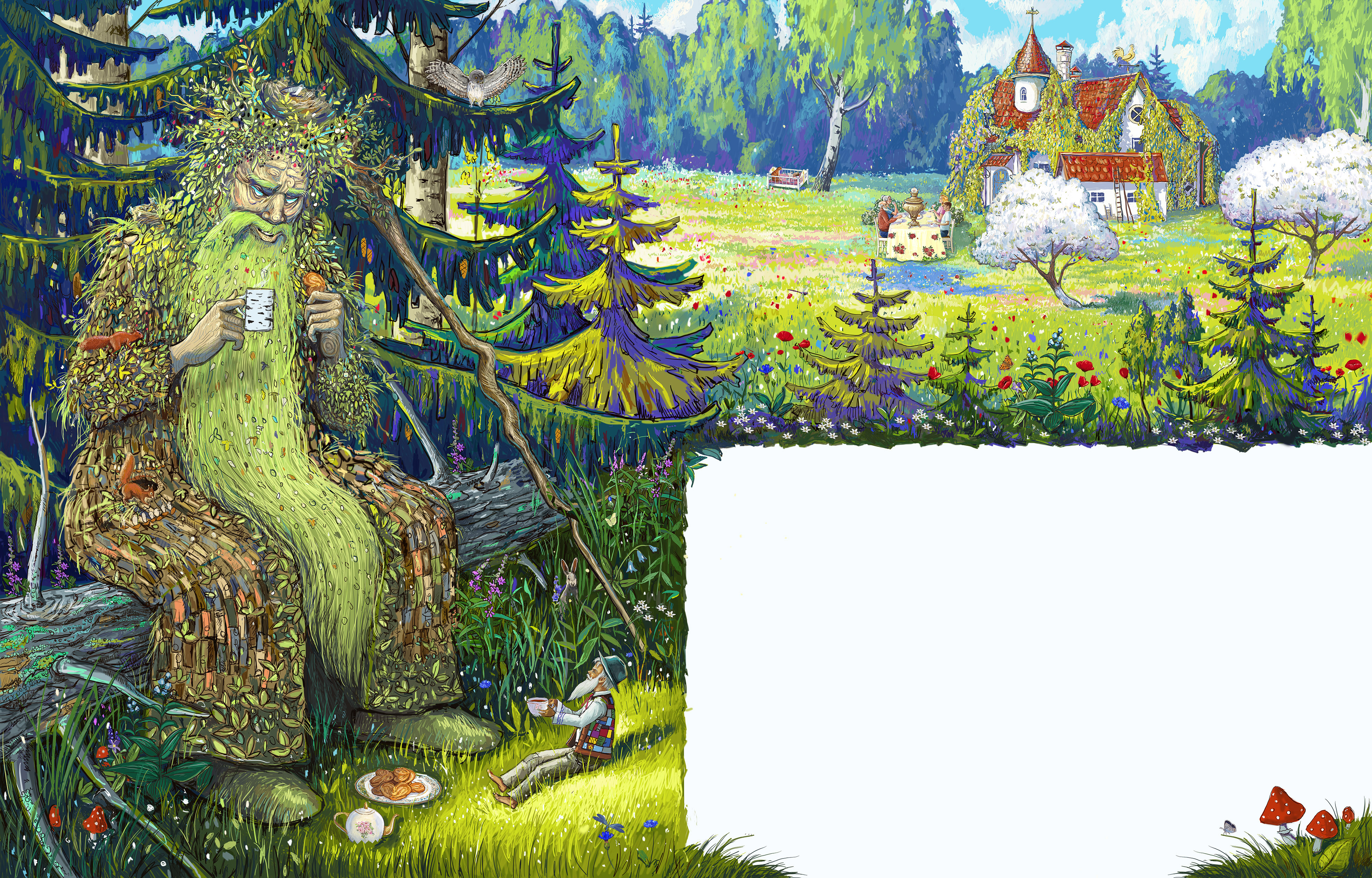 Леший и домовой пьют чай с плюшками бабушки Зины.(разворот)ы