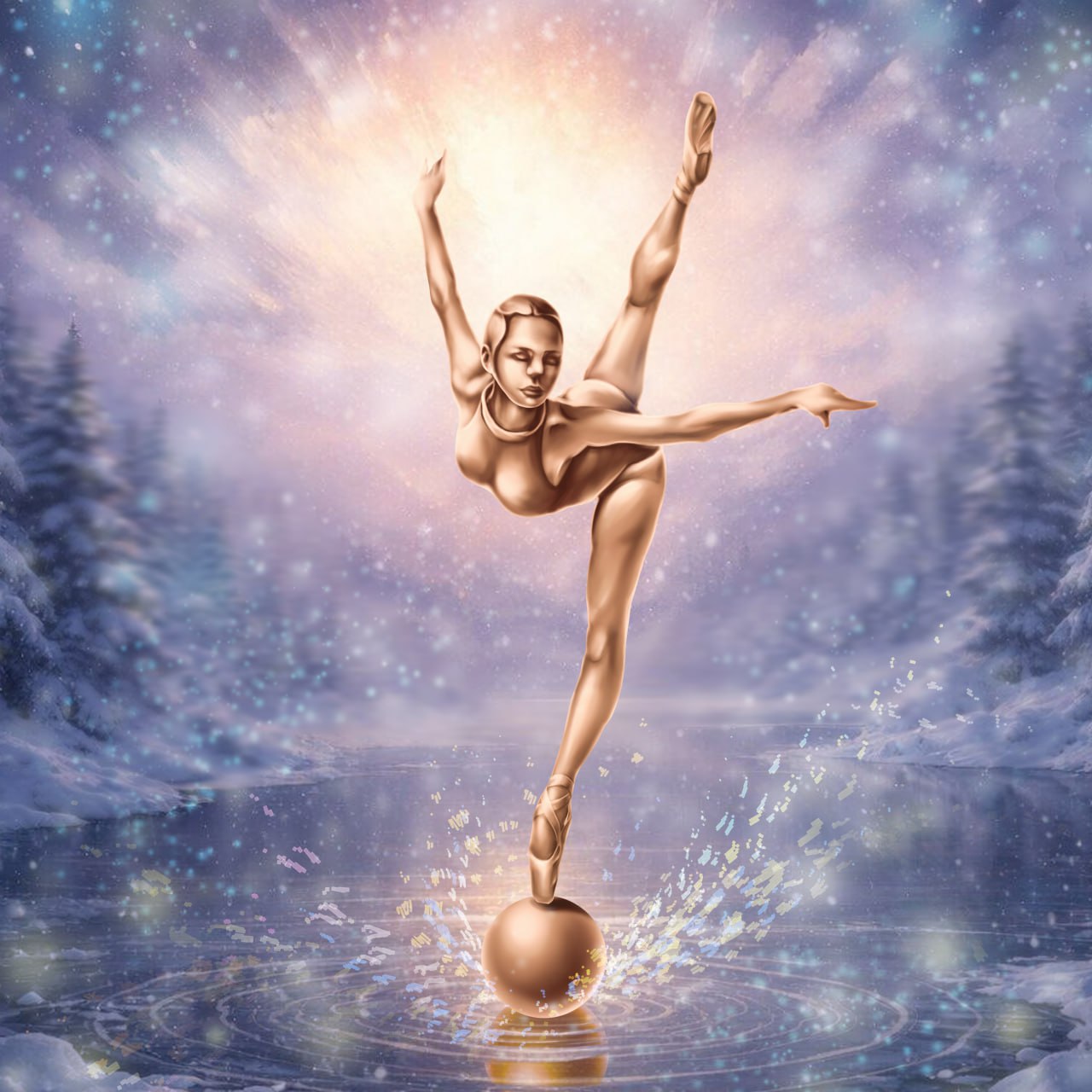 Статуэтка балерины, танцующей на шаре на фоне зимней реки