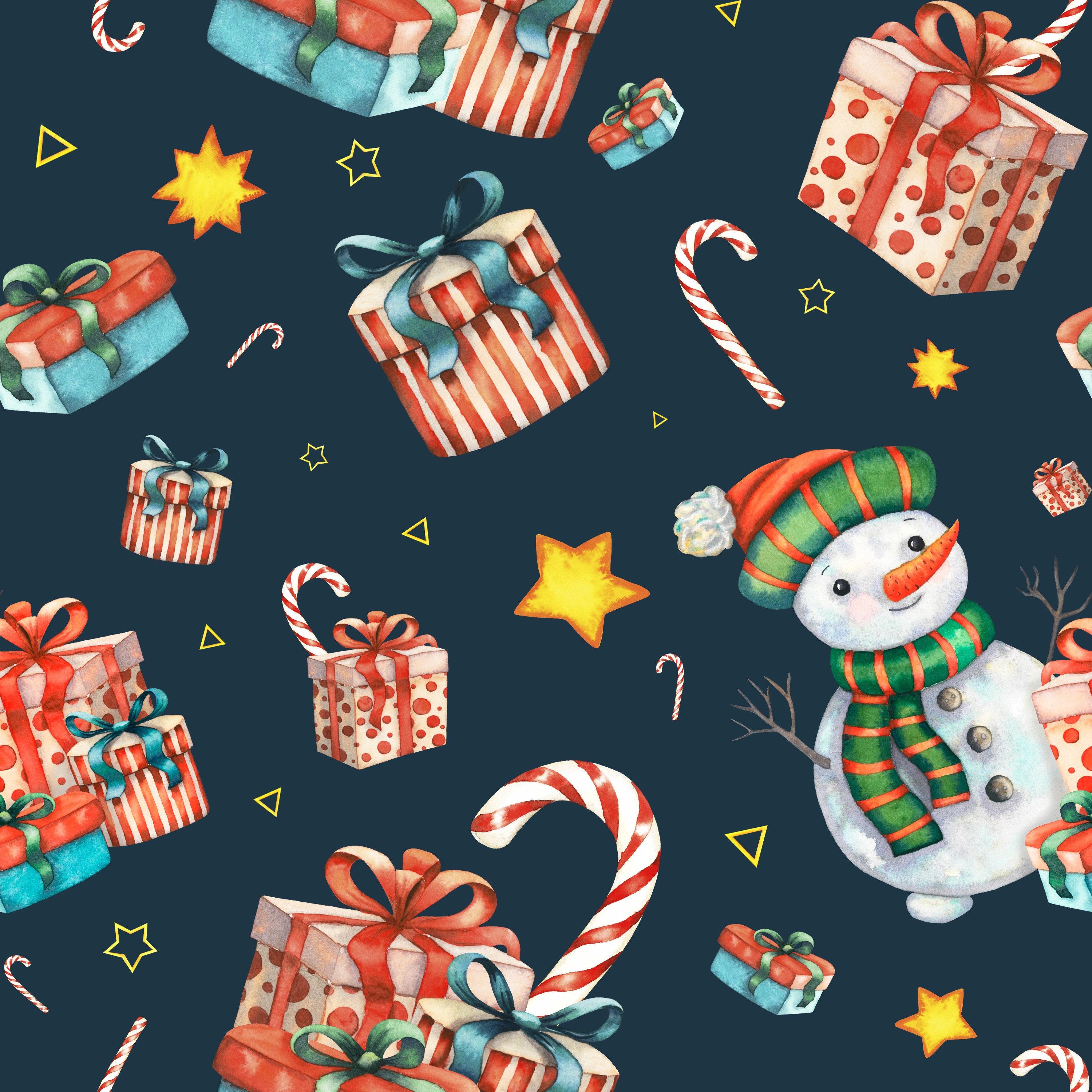 Новогодний бесшовный паттерн для упаковочной бумаги со снеговиком, подарками, звездами и новогодними символами, выполненный акварелью