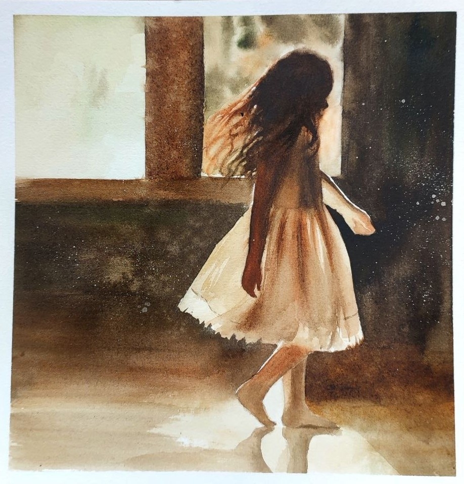 Силуэт девочки в залитой солнцем комнате. Акварель на хлопковой бумаге