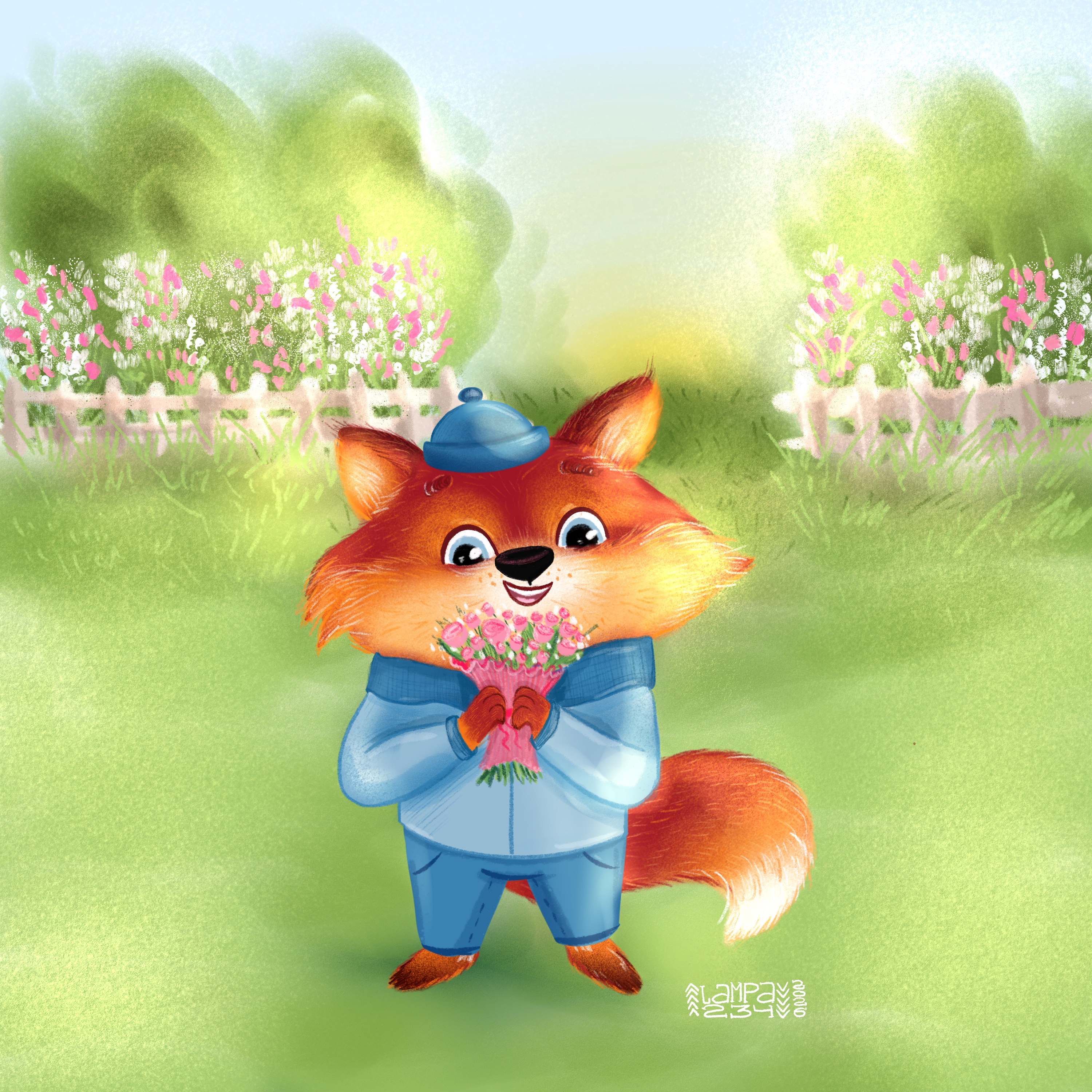 Иллюстрация влюбленного лисенка с букетом.